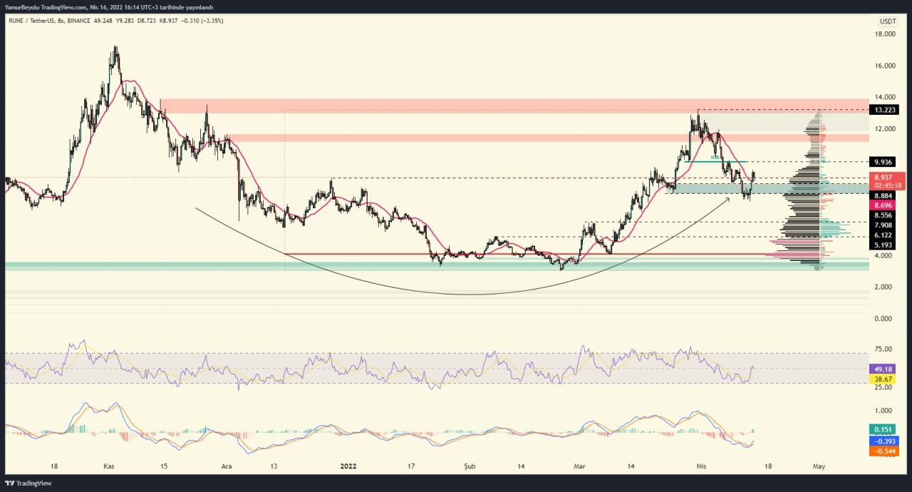 BeInCrypto Türkiye analistlerinden RainDrop Crypto ise yeni günde paylaştığı analizinde, RUNE’un şubat ayından itibaren bir yükseliş trendi içerisinde olduğuna dikkat çekti. Tecrübeli analist, popüler altcoin projesinin 7,4 dolar seviyelerine uzanan düşüş sürecinde alıcıları topladığını da açıkladı: