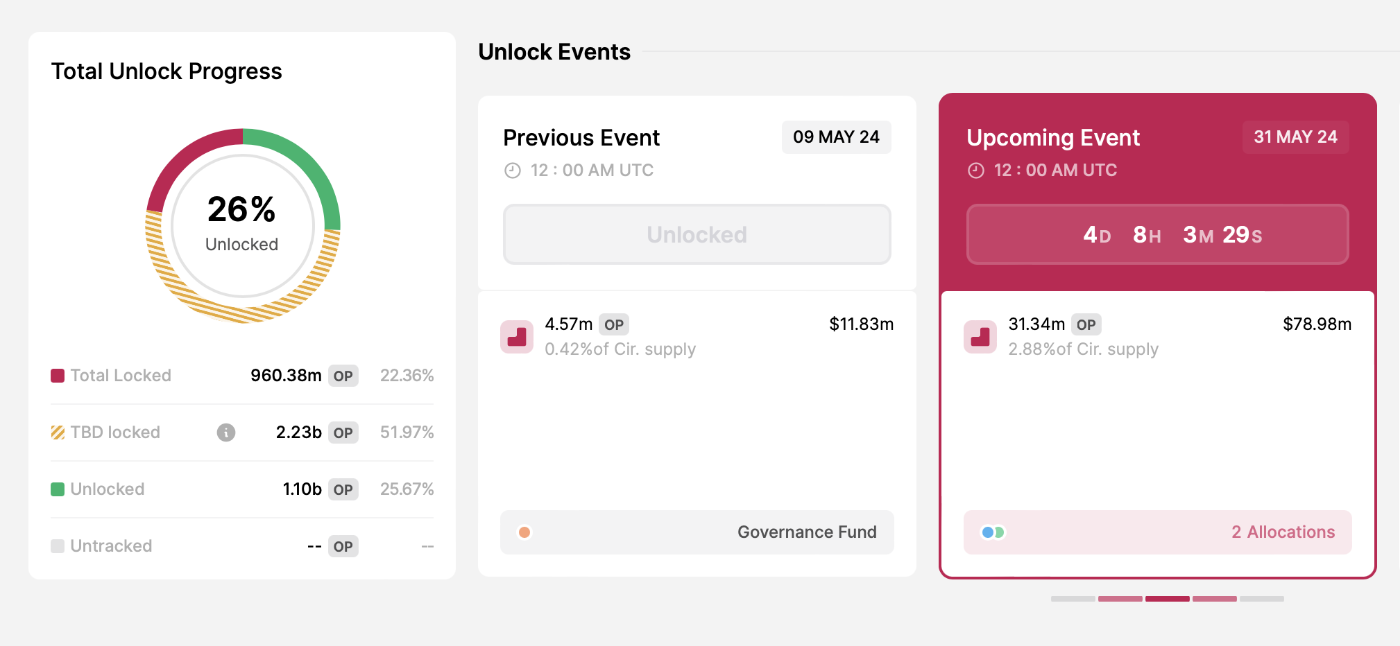 31 Mayıs’ta proje, dolaşımdaki arza 30 milyondan fazla OP ekleyecek. TokenUnlocks’a göre dağıtım, bu tokenleri yatırımcılara ve temel katkıda bulunanlara tahsis edecek.