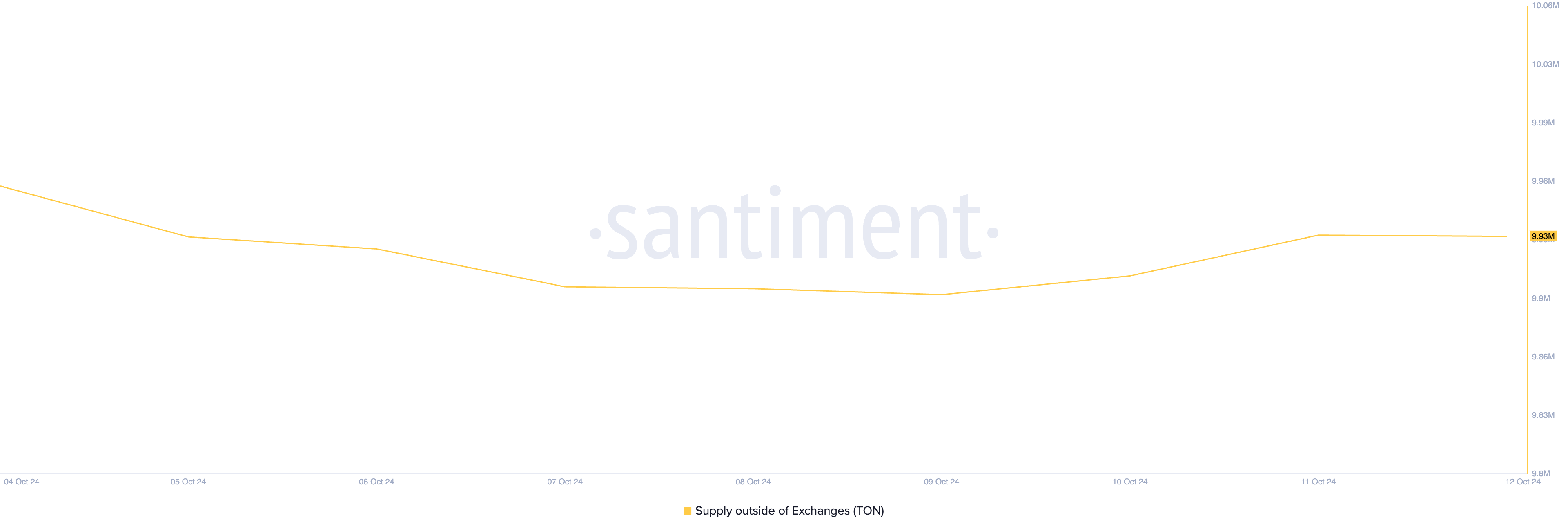 Öte yandan, incelenen hafta boyunca, borsa dışında tutulan TON token’ları miktarı azaldı, sahiplerinin kar realizasyonu faaliyetlerini doğruladı. Şu anda, borsa dışında 9,93 milyon TON token’ı tutuluyor ve geçtiğimiz yedi gün içinde %0,3 düştü.