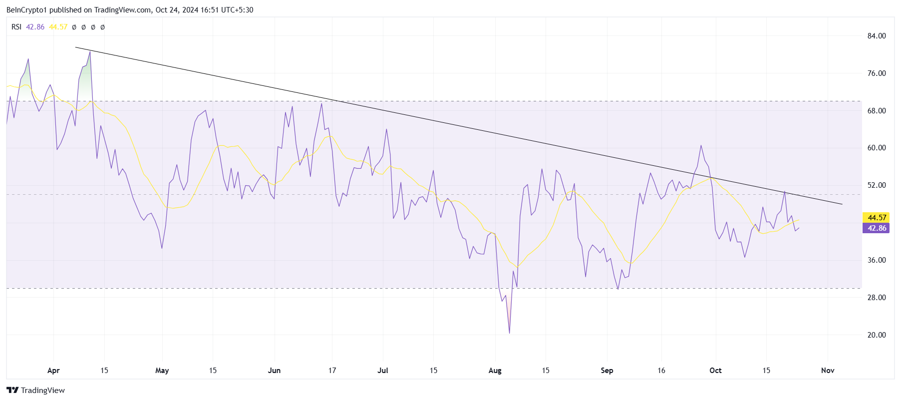 Toncoin’in makro momentumu da zorluklarla karşı karşıya, Göreceli Güç Endeksi (RSI) düşüş eğilimi gösteriyor. Önemli bir teknik gösterge olan RSI, şu anda nötr çizginin üzerinde bir pozisyon sağlamayı başaramıyor. Artan ayı momentumunu işaret ediyor. Toncoin bu makro düşüş trendinden çıkamazsa, ayı baskısı artmaya devam edebilir, fiyatını olumsuz etkileyebilir.