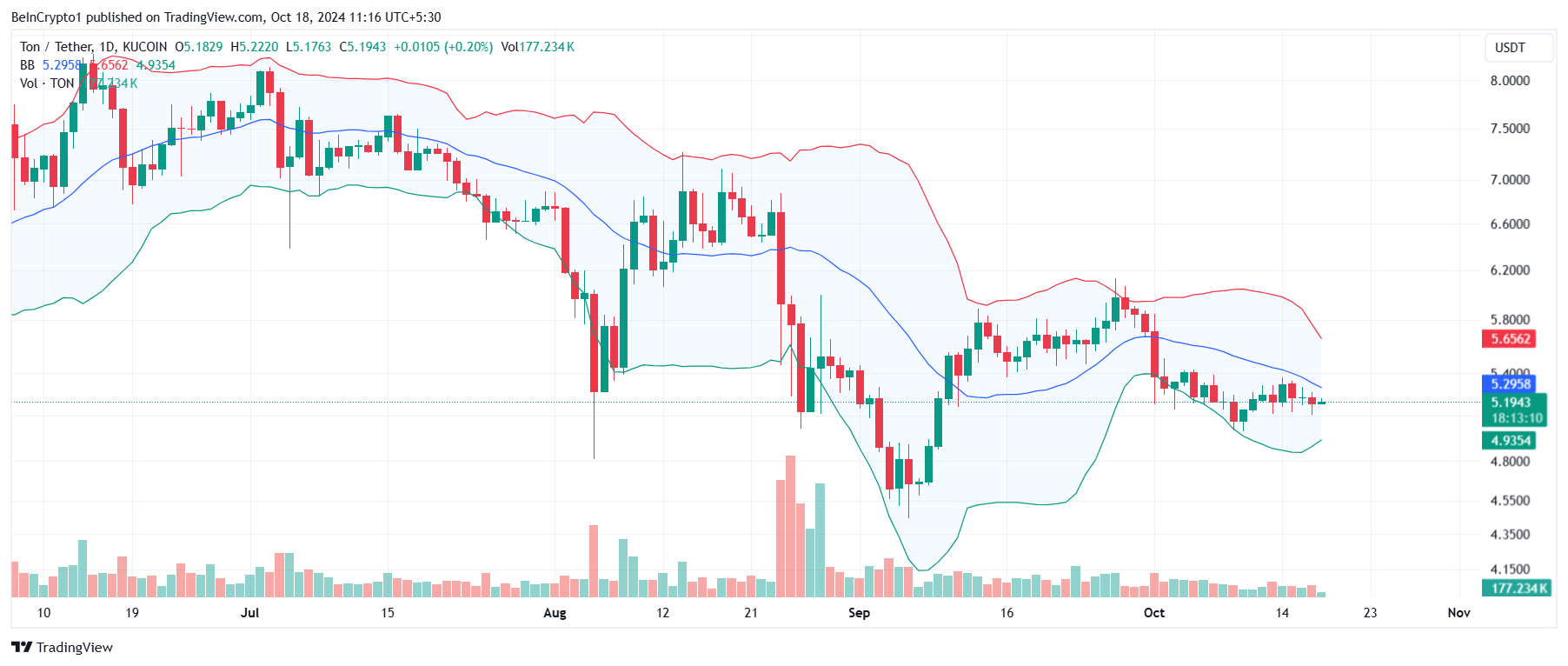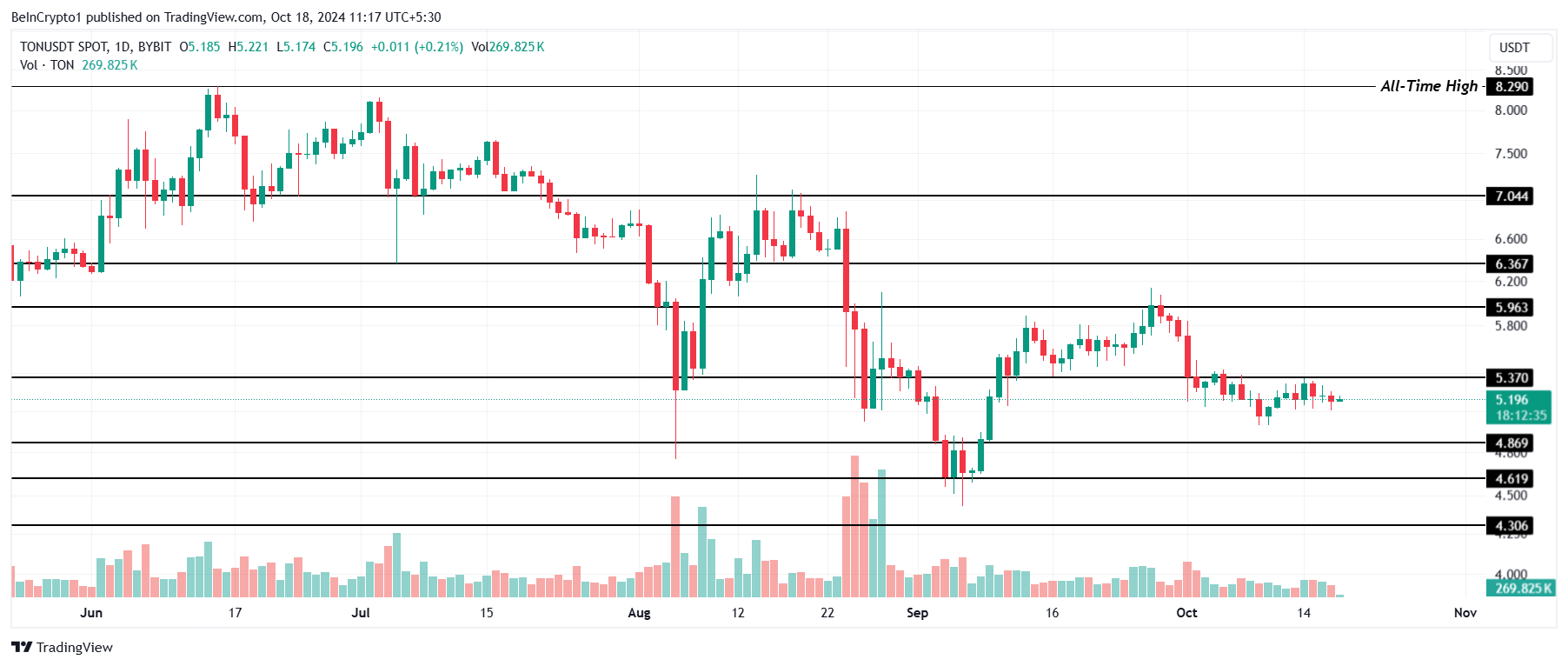 Toncoin şu anda 5,19 dolardan işlem görüyor, kritik 5,37 dolar direnç seviyesine çok yakın. Bu engeli aşmak, 6,00 dolara doğru potansiyel bir ralli için kritik. Yatırımcılar, bu önemli seviyeyi aşmanın boğa koşusunu işaret edebileceği için yakından izliyor.