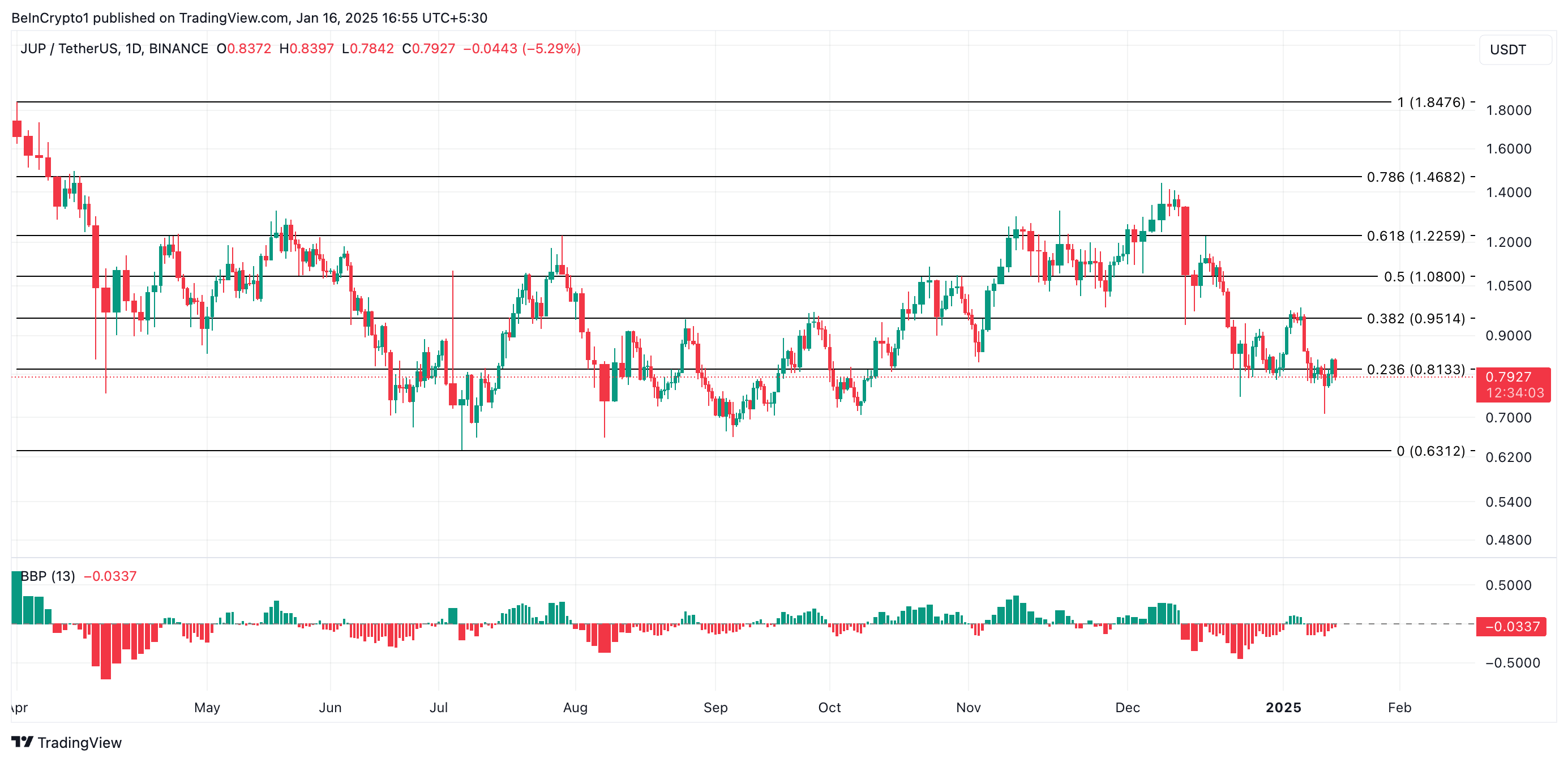 JUP bugün trend olan altcoin’lerden biri: şu anda 0,79 Dolar’dan işlem görüyor ve fiyatı son 24 saatte %1 arttı. Ancak, günlük grafiğinden alınan veriler, fiyat artışının altcoin’e olan talepten ziyade genel piyasa rallisi tarafından yönlendirildiğini gösteriyor. Bu durumu, şu an itibarıyla -0,03 olan negatif Elder-Ray Endeksi yansıtıyor.