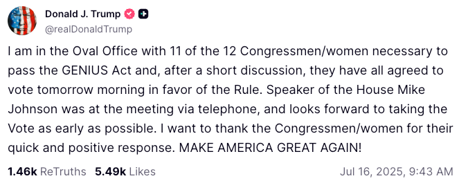 ‘Oval Ofis’te GENIUS Yasası’nı geçirebilmek için gerekli 12 Kongre üyesinden 11’i ile birlikteyim ve kısa bir tartışmanın ardından hepsi yarın sabah Kural lehine oy kullanmayı kabul etti,’ Trump Truth Social üzerinde paylaştı.