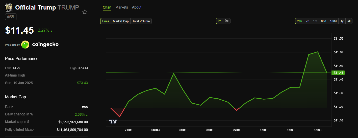 Bekleme listesinin net bir bitiş tarihi yok, ancak kullanıcıları TRUMP token’ları satın almaya teşvik ediyor. Meme coin, birkaç hafta önce sona eren yemekten bu yana artan satışlar gördü. Ancak, bugünkü cüzdan duyurusu kısa bir artış getirdi.