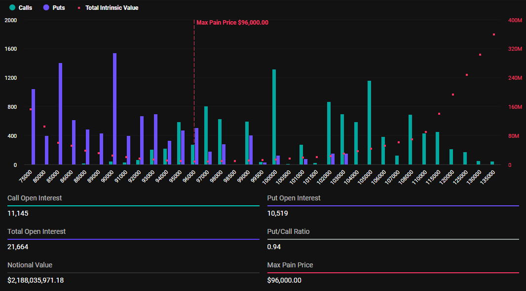 Maksimum kayıp noktası, varlığın en fazla sayıda yatırımcıya finansal kayıplar yaşatacağı fiyat, 96.000 Dolar. Burada, çoğu sözleşme değersiz olarak sona erecek.