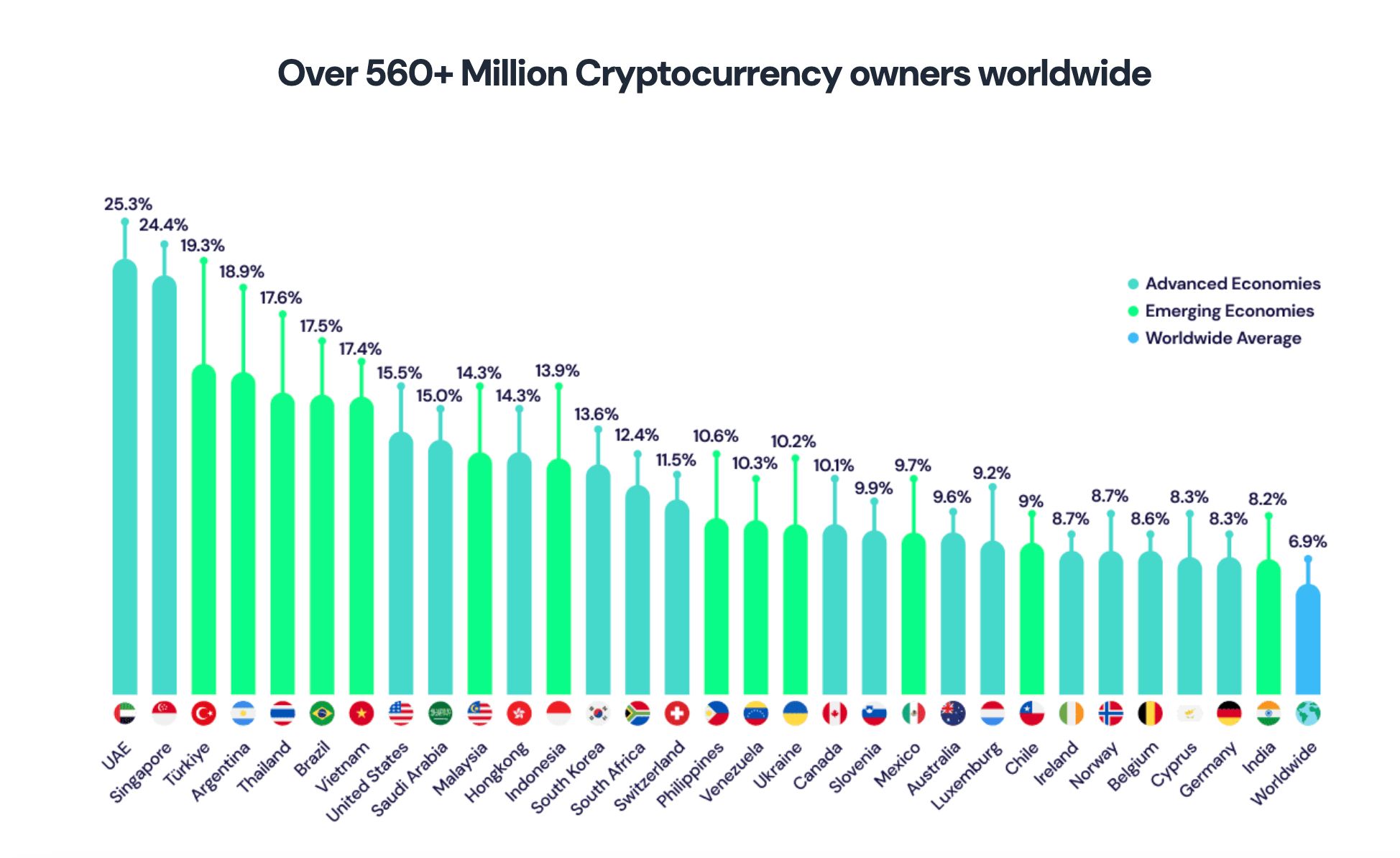Son yıllarda kripto endüstrisi, benimsenmedeki genel küresel artışla birlikte dikkate değer bir şekilde büyümüştür. Triple-A’nın 2024 raporuna göre, bugün dünya genelinde 562 milyon kişi dijital para birimlerinin bir kısmına veya çeşitli biçimlerine sahiptir ve bu rakam bir önceki yıla göre %6,8’lik bir artışı temsil etmektedir.