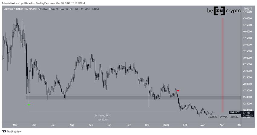 Ayrıca UNI, 241 gün boyunca 14,80 dolar bölgesi üzerinde hareket etti. Ancak 19 Ocak 2022 tarihinde bu bölgenin altına bir gerileme yaşandı. Böylece 24 Ocak’ta 7,51 dolar seviyesinde bir dip meydana geldi. Sonuç olarak UNI fiyatı, rekor seviyenin ardından yüzde 80 oranında değer kaybetti.