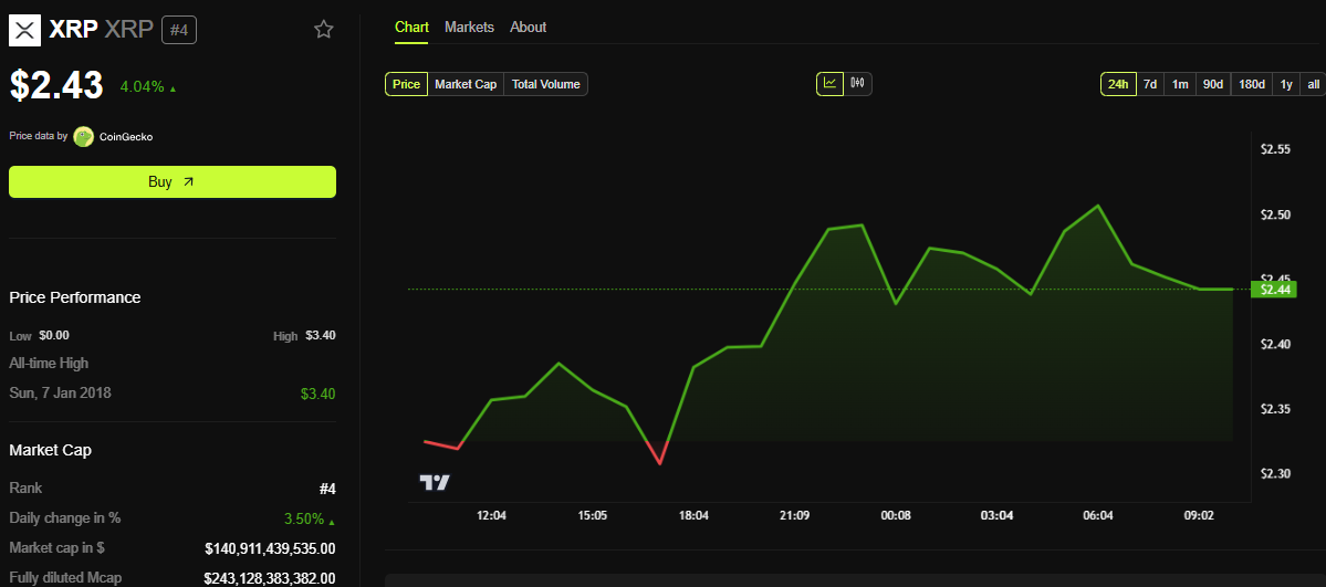 BeInCrypto verileri gösteriyor ki XRP, bu yazı yazıldığı sırada 2,43 Dolar’dan işlem görüyor ve Çarşamba günkü seans açıldığından bu yana %4’ten fazla artış gösterdi.