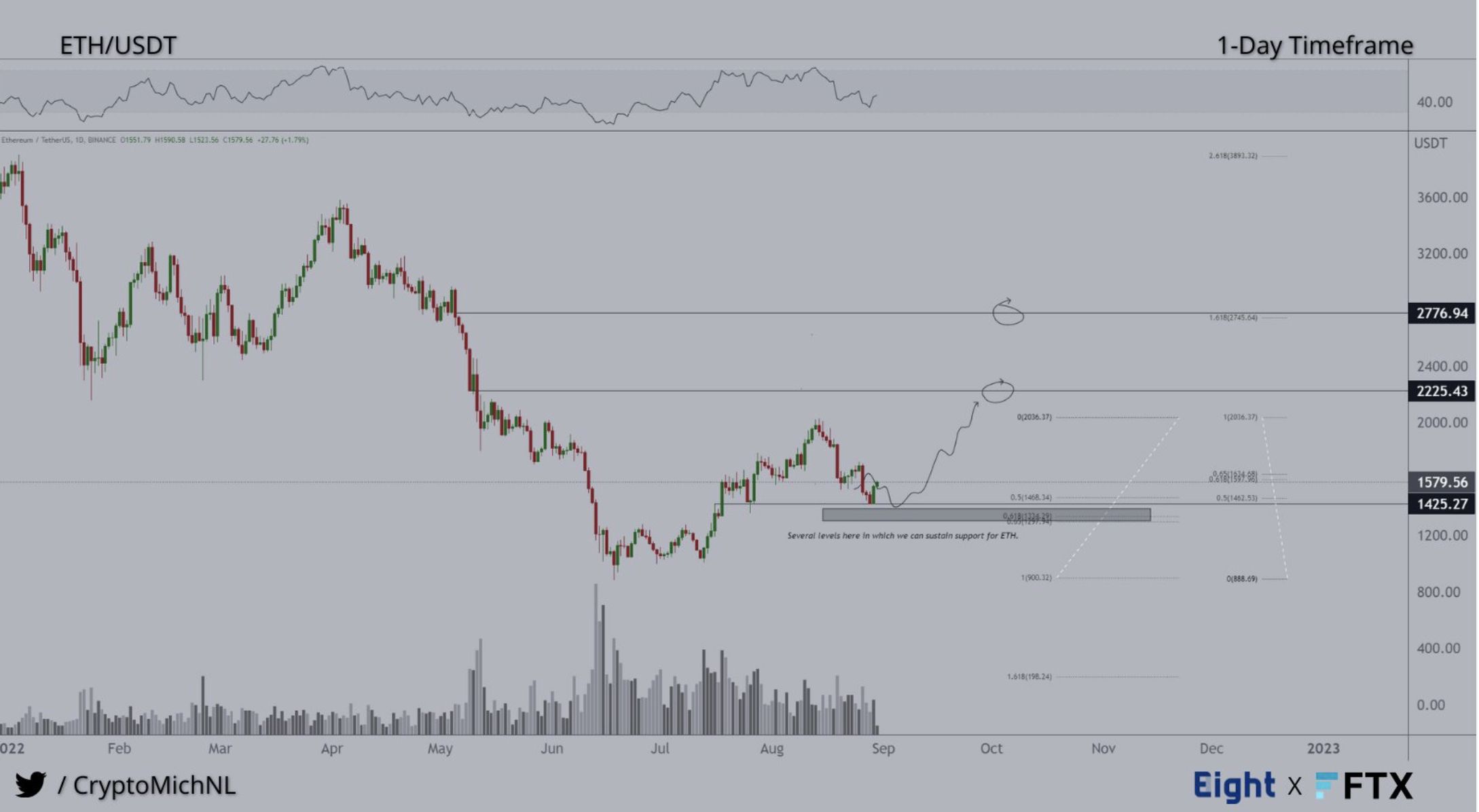 Twitter üzerinde 620.000’den fazla takipçisi bulunan Michaël Van de Poppe, Ethereum için 1.350 dolar desteğinin çalışması gerektiğine işaret etti. Analist desteğin korunması ve mevcut momentumun devam etmesi durumunda, ETH fiyatının 2.200 dolara kadar yükselebileceğine işaret etti: