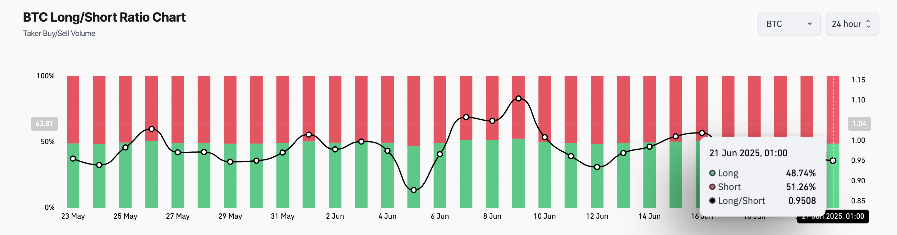 Coinglass’a göre, coin’in long/short oranı, trader duyarlılığının önemli bir ölçüsü, 17 Haziran’dan bu yana ağırlıklı olarak short’lara kaydı. BTC’nin son rallisinin momentum kaybedebileceğine dair artan bir inancı gösteriyor. Basın zamanında, oran 0,95 ve bu da daha fazla trader’ın altcoin’e karşı bahis oynadığını gösteriyor.