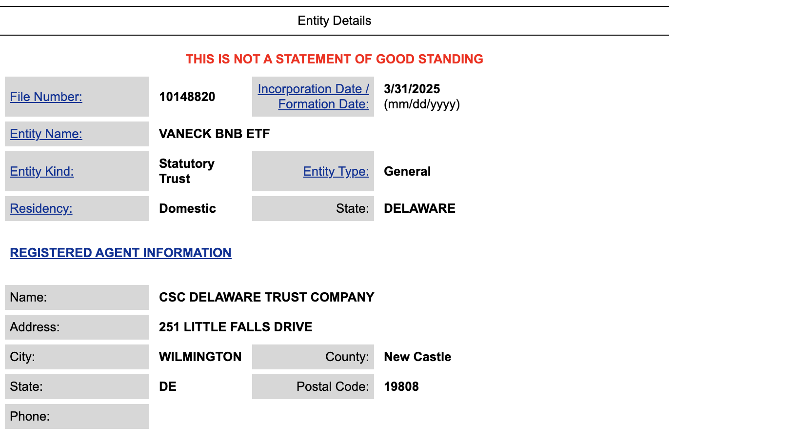 Güven fonu, 31 Mart tarihinde “VanEck BNB ETF” adı altında 10148820 dosya numarası ile kaydedildi. Delaware’in resmi devlet web sitesinde kaydedildi.