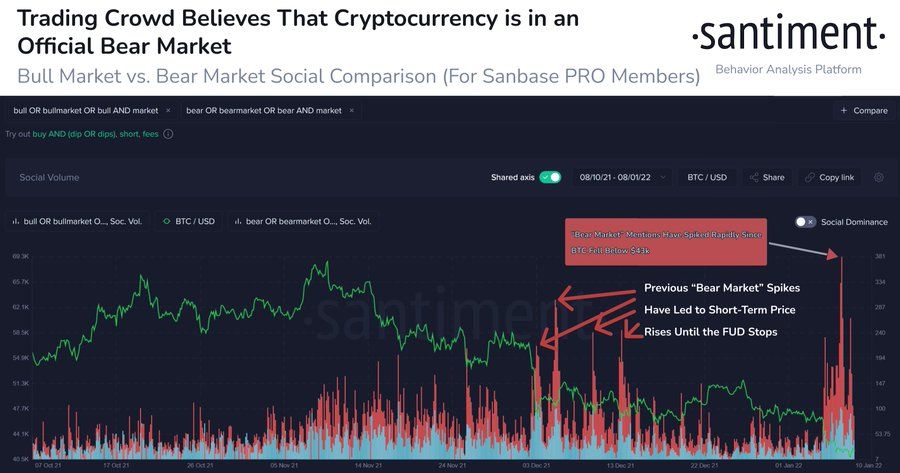 Ayı piyasası finans piyasalarında uzun süreli fiyat düşüşlerini tanımlamak için kullanılıyor. Santiment tarafından paylaşılan verilere göre Bitcoin’in 43.000 dolar seviyelerine gerilediği dönem itibariyle piyasadaki korku ve ayı piyasası beklentisi artıyor.
