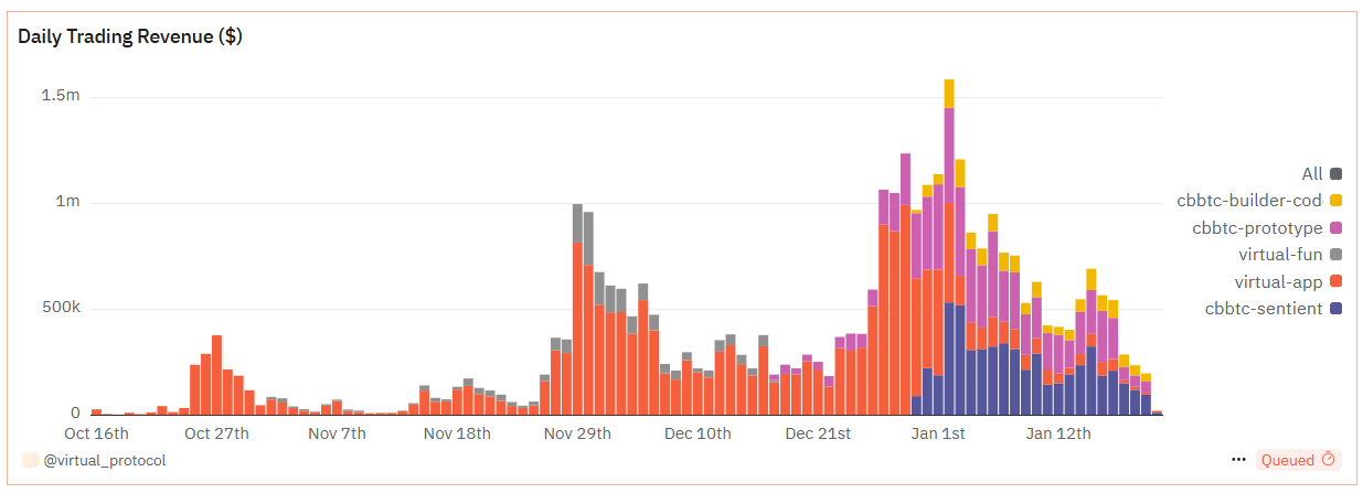 Virtuals Protocol, bir AI ajan platformu, günlük gelirinde büyük bir düşüş yaşıyor. Gelir, 2 Ocak’ta 1,58 milyon Dolar iken, 21 Ocak itibarıyla sadece 21.927 Dolar’a düştü.