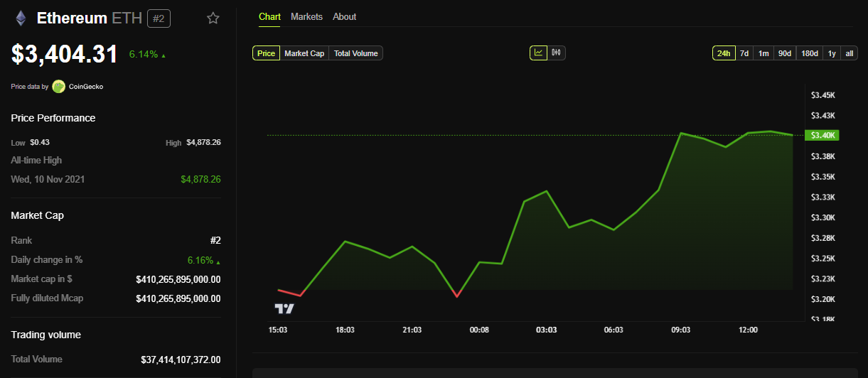 Sponsored SponsoredBeInCrypto verileri, ETH’nin bu yazı itibarıyla 3.404 Dolar’dan işlem gördüğünü ve Cuma günkü seans açılışından bu yana %6’dan fazla arttığını gösteriyor.