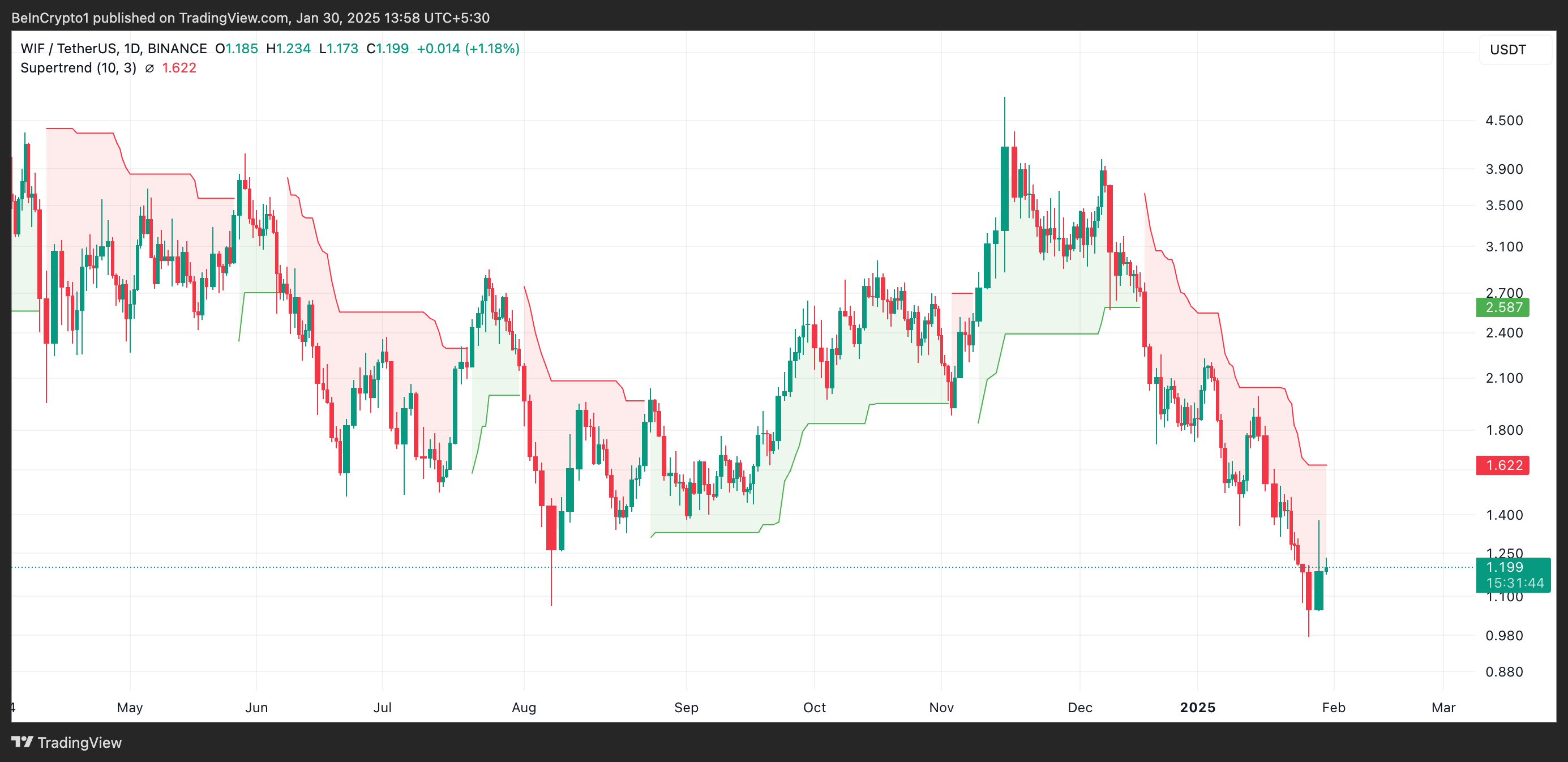 Bu gösterge, trader’ların piyasanın trendini belirlemesine yardımcı olur ve varlığın volatilitesine bağlı olarak fiyat grafiğinin üstüne veya altına bir çizgi yerleştirir. WIF ile olduğu gibi, bir varlığın fiyatı Super Trend çizgisinin altında işlem gördüğünde, bu düşüş trendini işaret eder ve piyasanın düşüşte olduğunu ve satış baskısının hakim olduğunu gösterir.