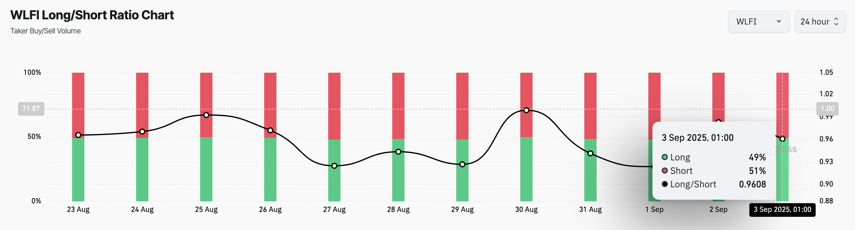 Ayrıca, zincir üstü veriler WLFI’nin long/short oranının ağırlıklı olarak short pozisyonlara yöneldiğini gösteriyor. Bu da trader’ların giderek daha fazla token’a karşı bahis oynadığını gösteriyor. Bu yazı itibarıyla, metrik 0,96 seviyesinde.