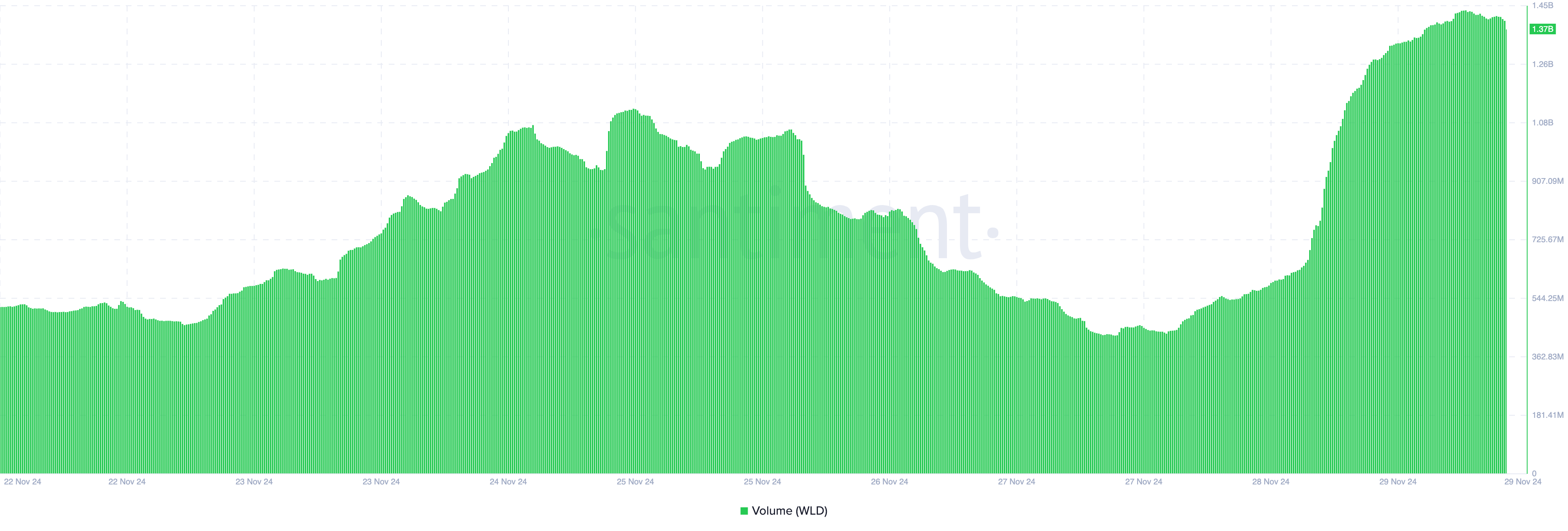 Daha fazla artışı destekleyen bir metrik, WLD’nin hacmidir. Hacim, piyasanın bir token’ı aktif olarak trade ettiğini gösterir. Hacim arttığında, kripto paraya daha fazla likidite akışı olur.