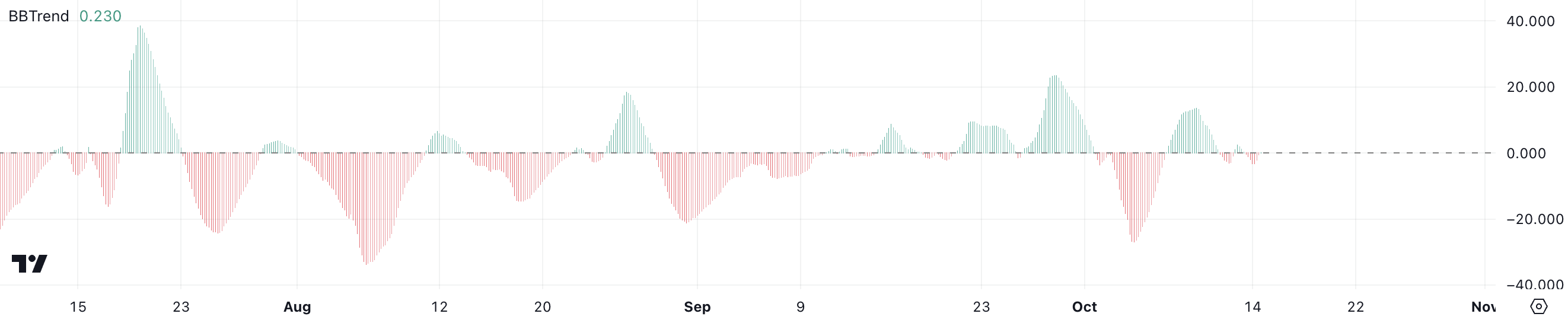 Bu, yükseliş trendinin gücünün azaldığını ve potansiyel bir tersine dönüş veya daha fazla konsolidasyon olabileceğini öneriyor. Azalan BBTrend okuması, piyasanın aşırı genişlediğini ve yükseliş trendinin buharını kaybedebileceğini işaret ediyor.
