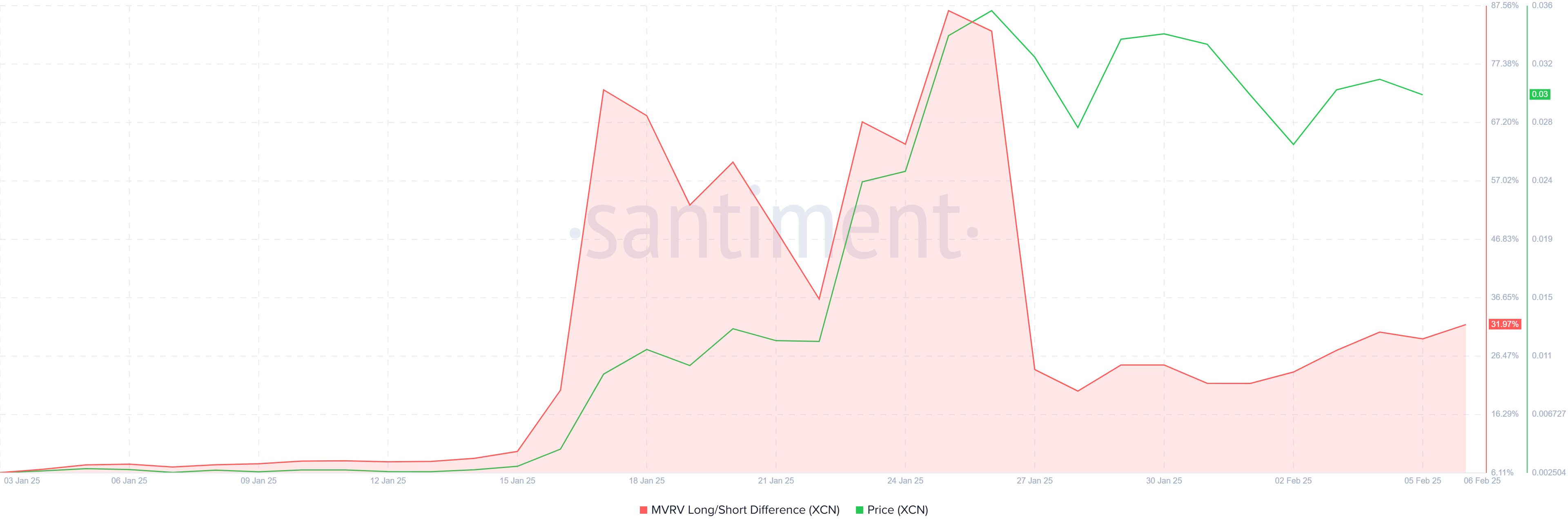 Zayıf ağ büyümesine rağmen, XCN’in uzun vadeli sahipleri (LTH’ler) MVRV Uzun/Kısa Farkı ile gösterildiği gibi kârda kalmaya devam ediyor. Bu metrik, çeşitli yatırımcı gruplarının kârlılığını vurgular. LTH’ler sıkı durdukça, altcoin önemli fiyat seviyelerini korumayı başardı ve keskin bir düşüşü önledi.