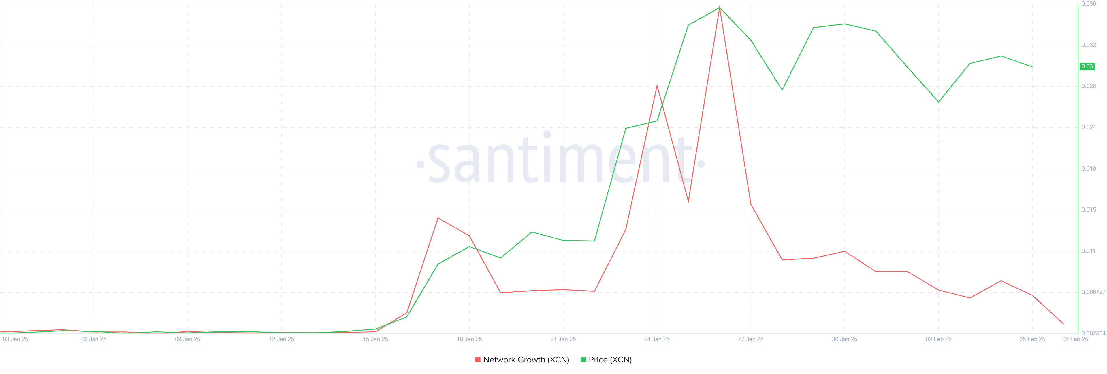 XCN’in ağ büyümesi önemli ölçüde azaldı ve aylık bir düşüşe ulaştı. Bu metrik, ağ ile etkileşime giren yeni adreslerin sayısını yansıtır. Bu rakamdaki sürekli düşüş, yatırımcı ilgisinin azaldığını gösterir ve kripto paranın ivme kazanmasını zorlaştırır.