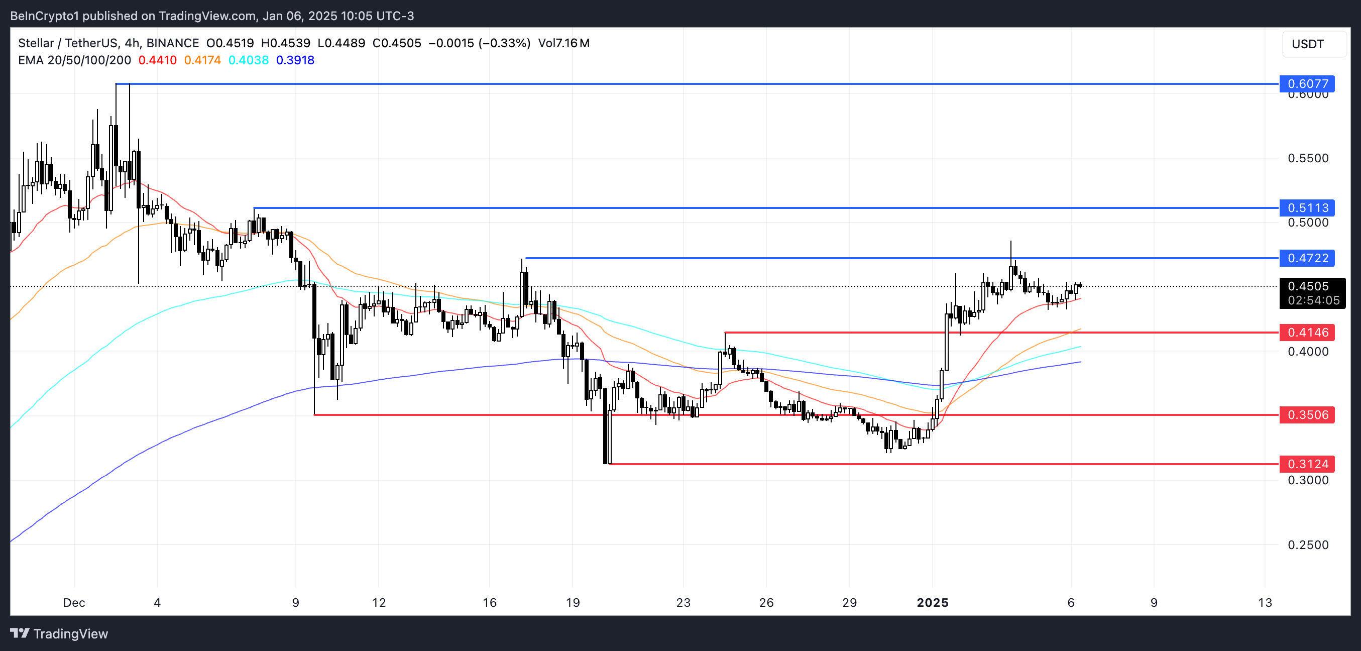 XLM’nin EMA çizgileri, 1 Ocak’ta oluşan ve son fiyat artışlarını tetikleyen altın kesişimi vurguluyor. Şu anda XLM, 0,47 Dolar direnç ve 0,41 Dolar destek seviyeleri arasında işlem görüyor ve direnç, geçmiş denemelerde bir engel olarak hareket ediyor.