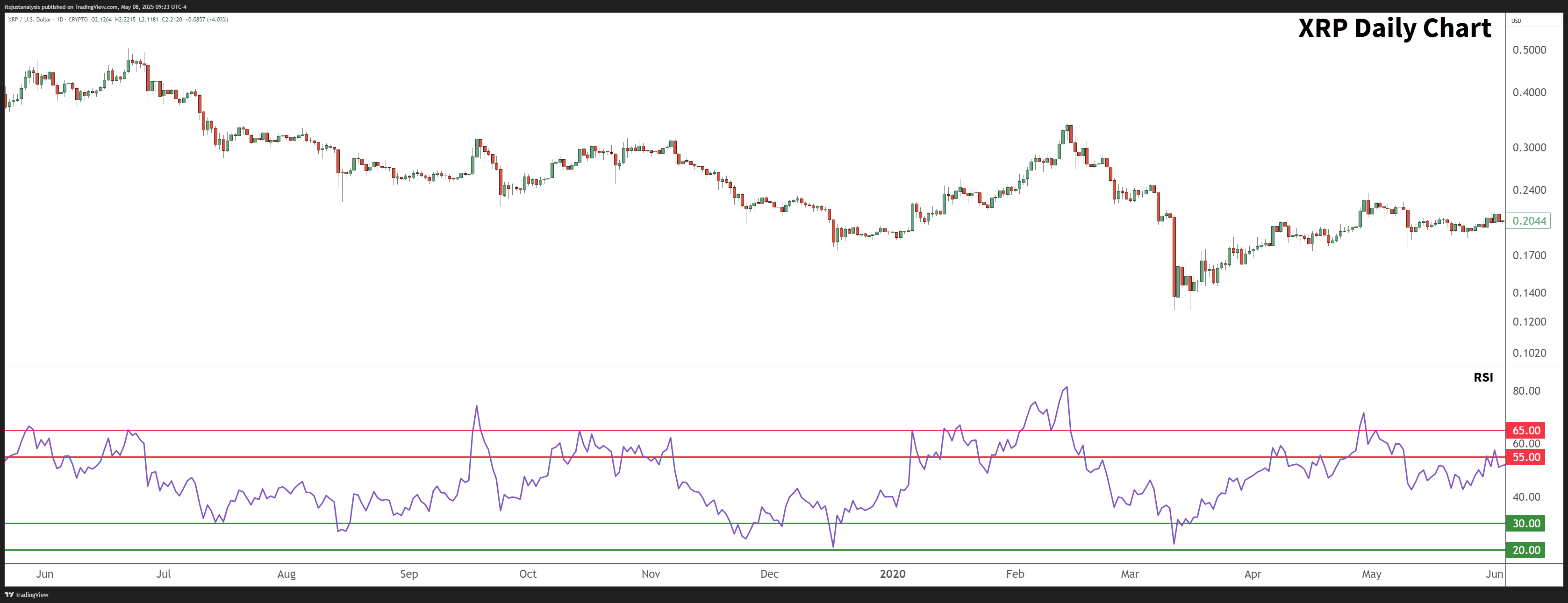 Örnek olarak: Mayıs 2019’dan Haziran 2020’ye kadar XRP’nin günlük grafiği