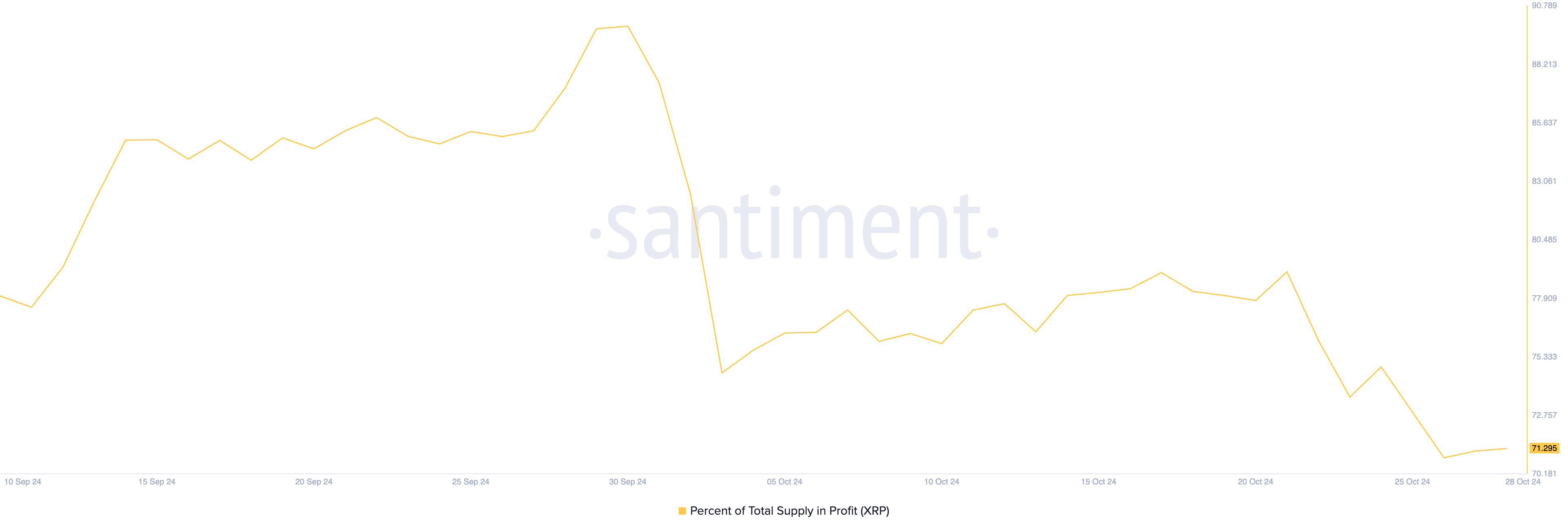Ayrıca, XRP balina aktivitesindeki azalma, karlı tutulan toplam arzda sürekli bir düşüşle birlikte gerçekleşiyor. Zincir üstü verilere göre, altcoin’in toplam arzının şu anda %71,29’u karlı durumda, bu oran 1 Ekim’de %89 idi. Bu, son 27 gün içinde önemli bir %20’lik düşüşü temsil ediyor.