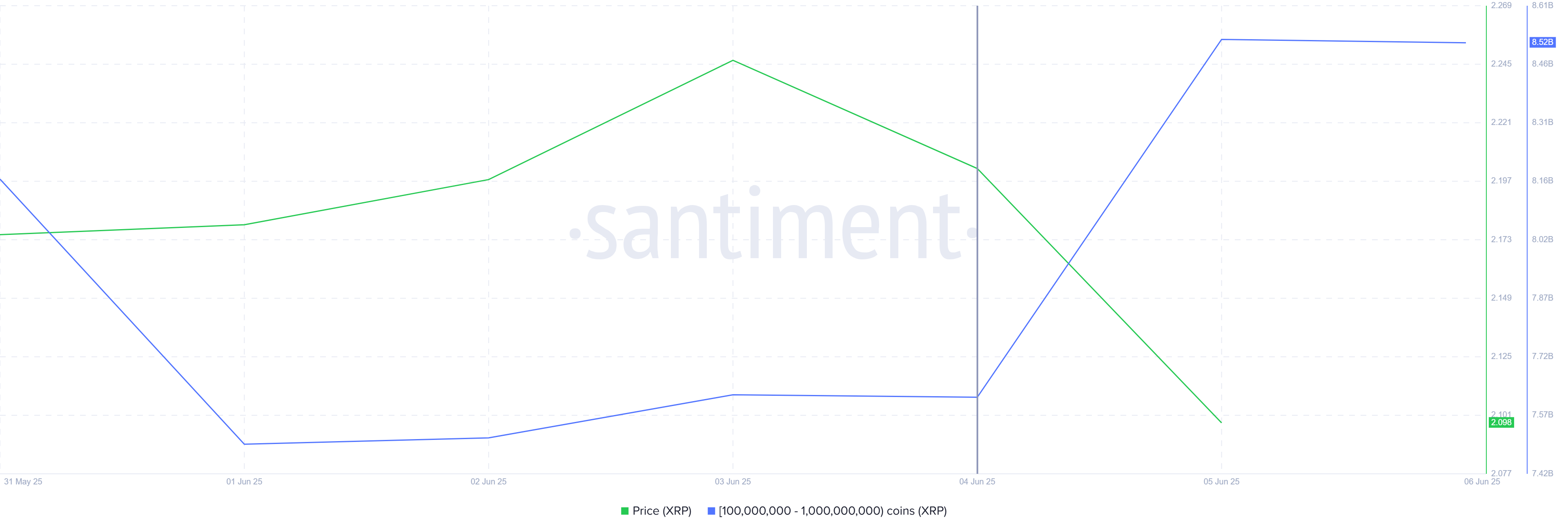 Son günlerde, XRP balinaları mevcut düşük fiyatların sunduğu fırsatı değerlendirdi. Sadece 48 saat içinde, 100 milyon ile 1 milyar XRP arasında tutan adresler, 1,9 milyar Dolar’dan fazla değere sahip neredeyse 900 milyon XRP biriktirdi.