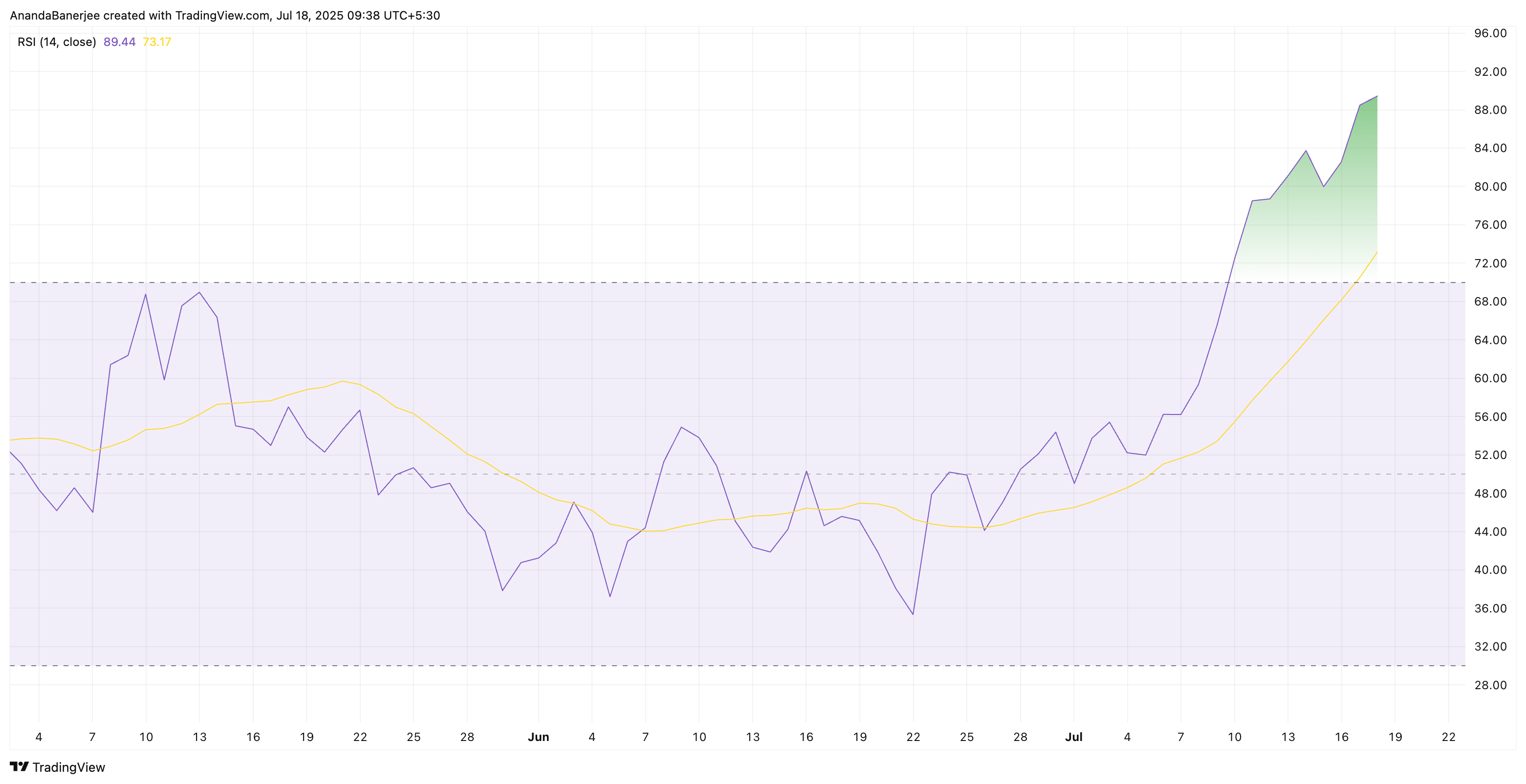 XRP’nin güçlü rallisi, günlük RSI (göreceli güç endeksi) değerini 89,44’e iterek aşırı alım koşullarını işaret ediyor. Bu, aşırı ısınmış MVRV seviyeleriyle uyumlu olup, kısa vadeli heyecanın zirveye ulaşabileceğini gösteriyor. Tarihsel olarak, 85’in üzerindeki RSI, güçlü boğa trendlerinde bile soğuma dönemleri veya kısa geri çekilmelerden önce gelir.