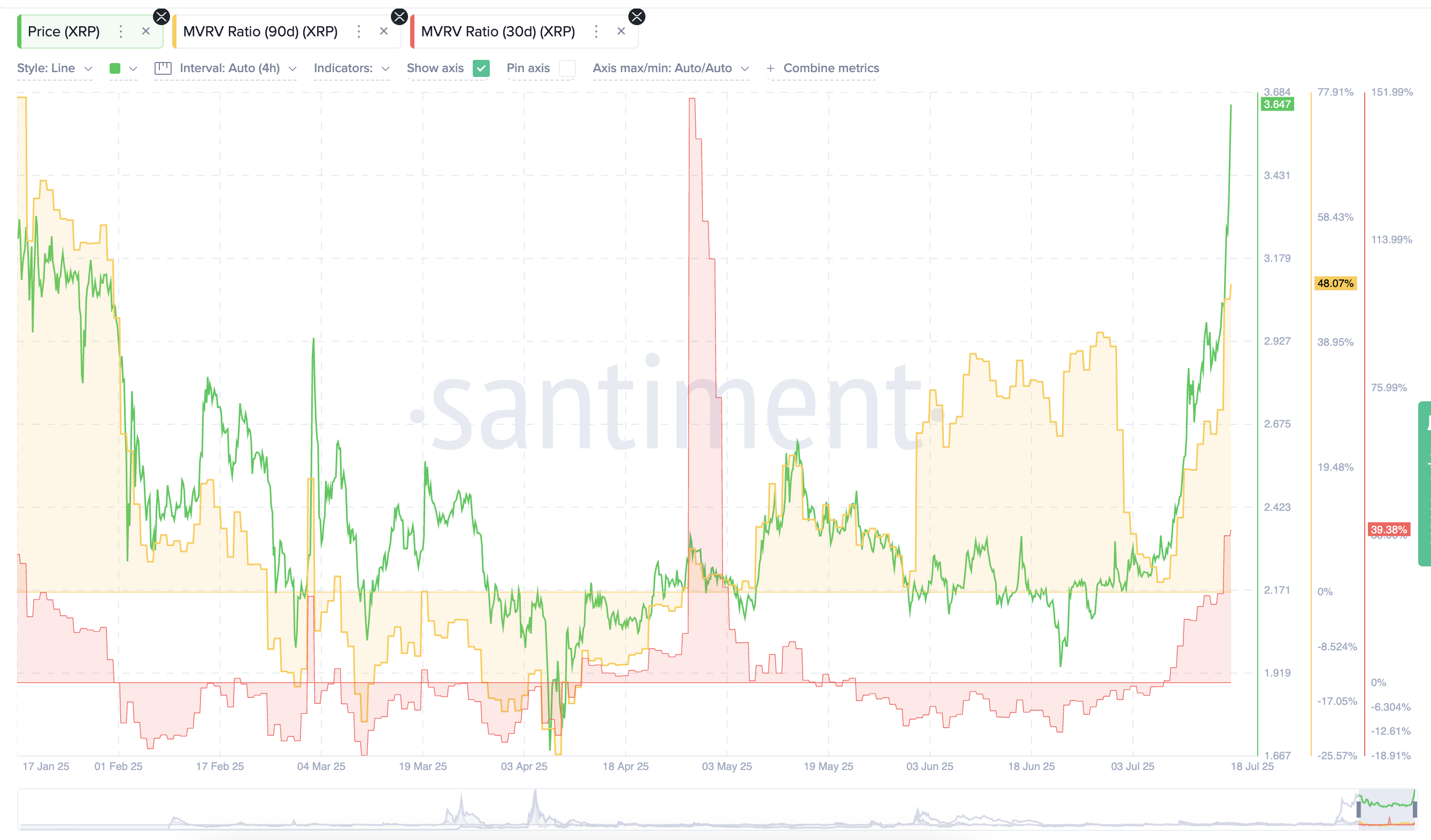 İlk işaret, 90 günlük MVRV (Piyasa Değeri / Gerçekleşen Değer) oranından geliyor ve şu anda %48,07’ye yükselmiş durumda. Bu sayı, XRP’yi 90 gün boyunca elinde tutan cüzdanların ne kadar kar elde ettiğini takip ediyor.