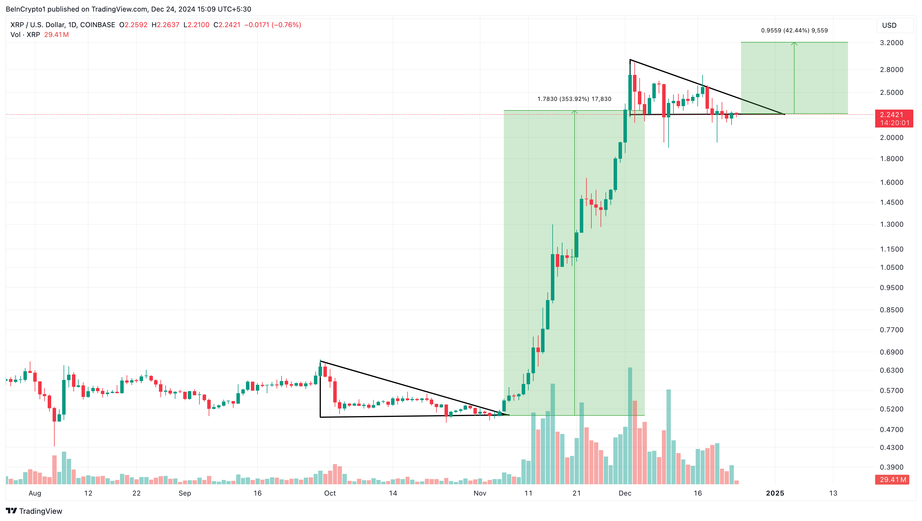 Fiyat yatay çizginin altına düştüğünde, genellikle düşüş devam eder. Tersine, üst trend çizgisinin üzerine çıkmak genellikle önemli bir yükselişi tetikler. 7 Kasım civarında, XRP bu modelden çıktı. Bunun ardından %350’lik dikkat çekici bir fiyat artışı yaşandı.