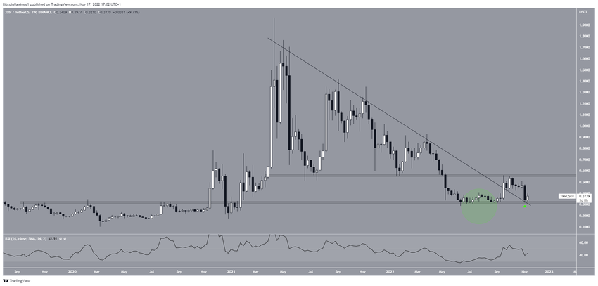 Haziran ve Ağustos 2022 arasında XRP, 0,32 dolar yatay destek bölgesi üzerinde birkaç kere sıçrama gerçekleştirdi (yeşil daire). Bu sıçramalar sayesinde Eylül ayı başlarında, uzun vadeli alçalan direnç çizgisinden çıkış başarılı oldu. Bu çizgi, 2021 yılının tepe noktası olan 1,96 dolar noktasından bu yana direnç görevi görüyordu.