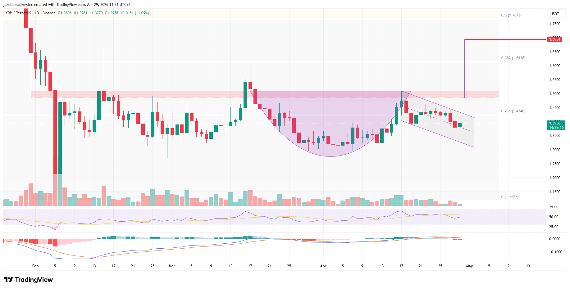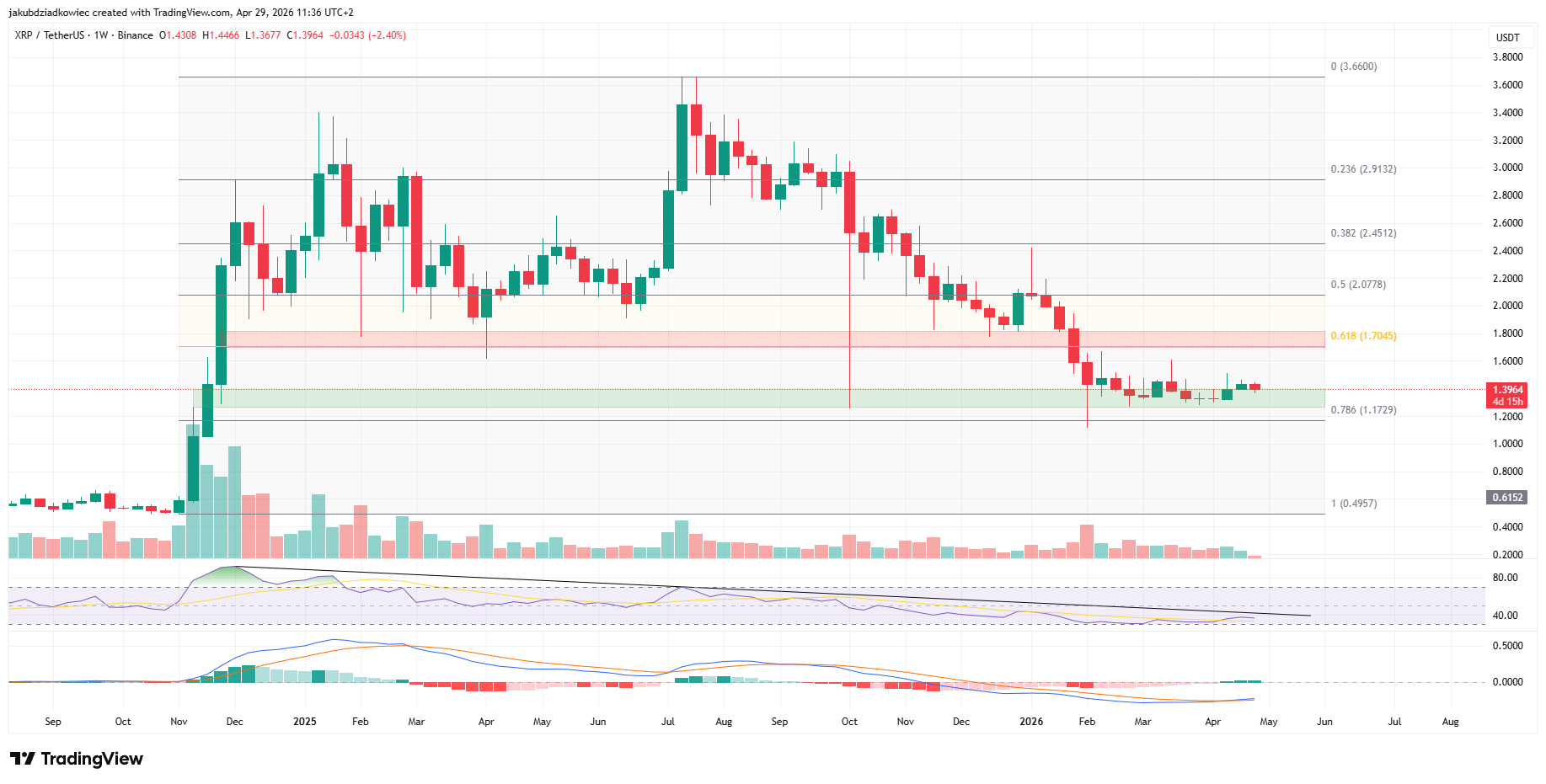 Zincir üstü risklere rağmen haftalık XRP/USDT grafiği, token’ın 1,17 dolar seviyesindeki 0,786 Fibonacci geri çekilmesini savunduğunu gösteriyor. Fiyat, şubat ayından bu yana 1,30 ile 1,45 dolar aralığında sabitlendi ve sıkı bir birikim bölgesi oluşturdu.