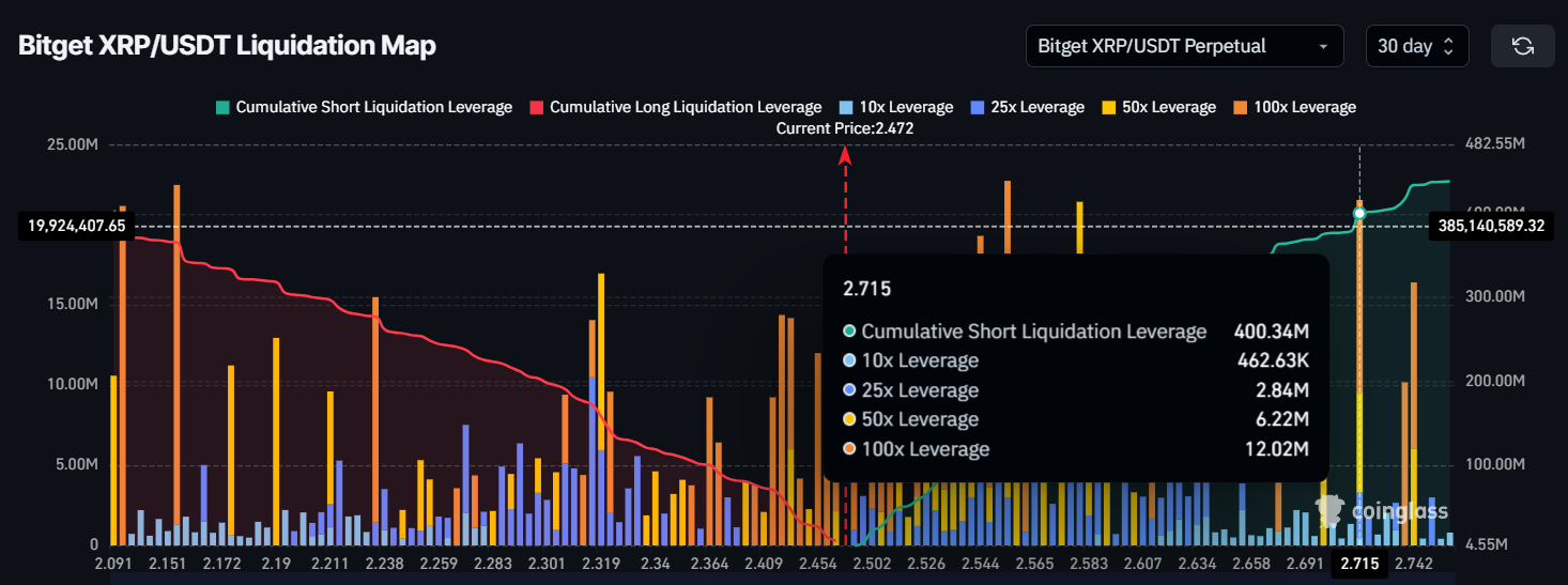 XRP’nin likidasyon haritası, kısa pozisyon sahipleri için endişe verici bir senaryo ortaya koyuyor. Mevcut fiyat ile 2,70 Dolar arasında yaklaşık 400 milyon Dolar değerinde kısa kontrat bulunuyor. Bu büyük kısa pozisyon hacmi, trader’ların XRP’nin fiyat hareketine karşı bahis oynadığını gösteriyor ve piyasadaki baskın şüpheciliği yansıtıyor.