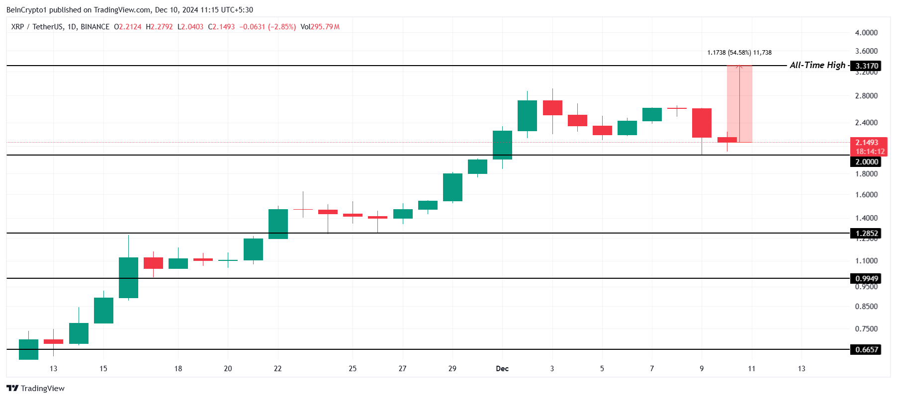 XRP’nin fiyatı şu anda 2,14 dolar seviyesinde, önceki ATH’si olan 3,31 doların yaklaşık %54 uzağında. Altcoin, kritik 2,00 dolar destek seviyesinin üzerinde kalırken, yeni bir ATH’ye giden yol zorlu görünüyor. Azalan yükseliş momentumu ve artan düşüş eğilimi, 3,31 doların üzerine çıkmanın yakın gelecekte pek olası olmadığını gösteriyor.
