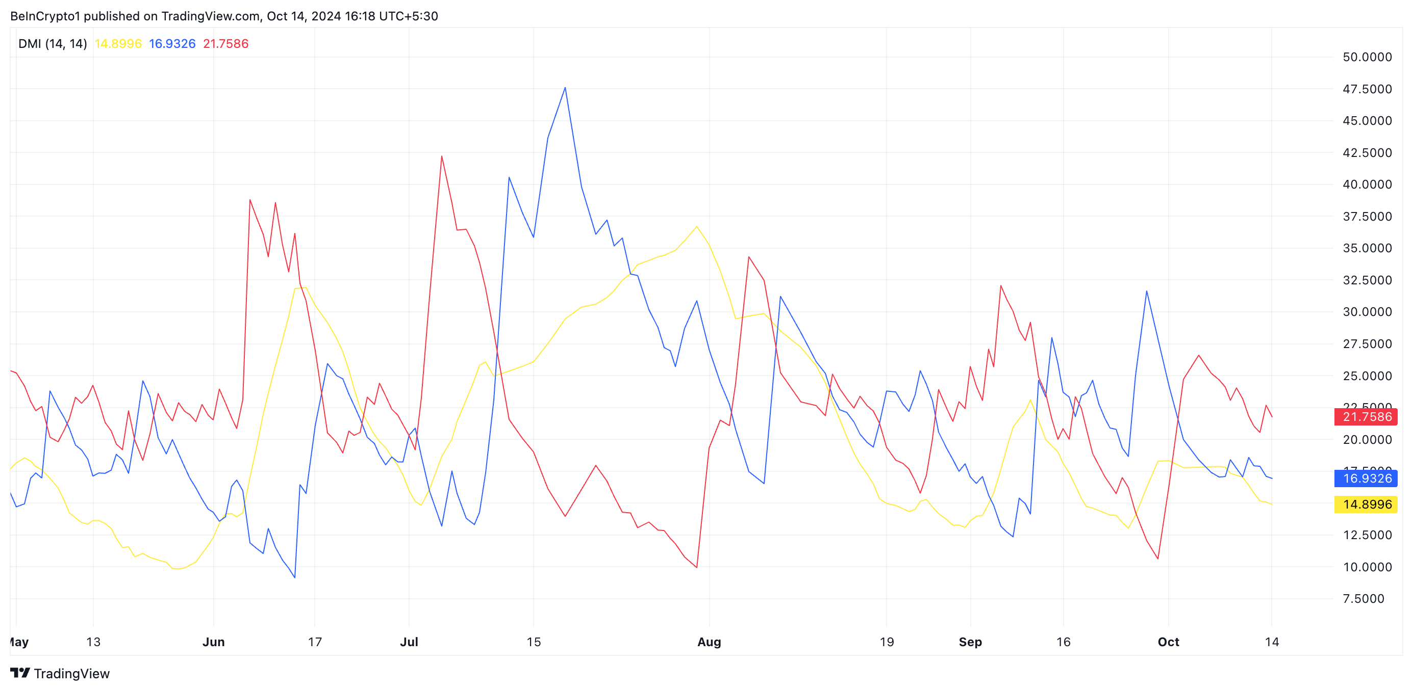 Ayrıca, XRP’nin Yönlendirme Hareket Endeksi (DMI) okumaları, bir günlük grafikte değerlendirildiğinde, altcoin’e karşı artan ayı ivmesini doğruluyor. Şu anda, token’ın Pozitif Yönlendirme Göstergesi (+DI), Negatif Yönlendirme Göstergesi (-DI)’nin altında.