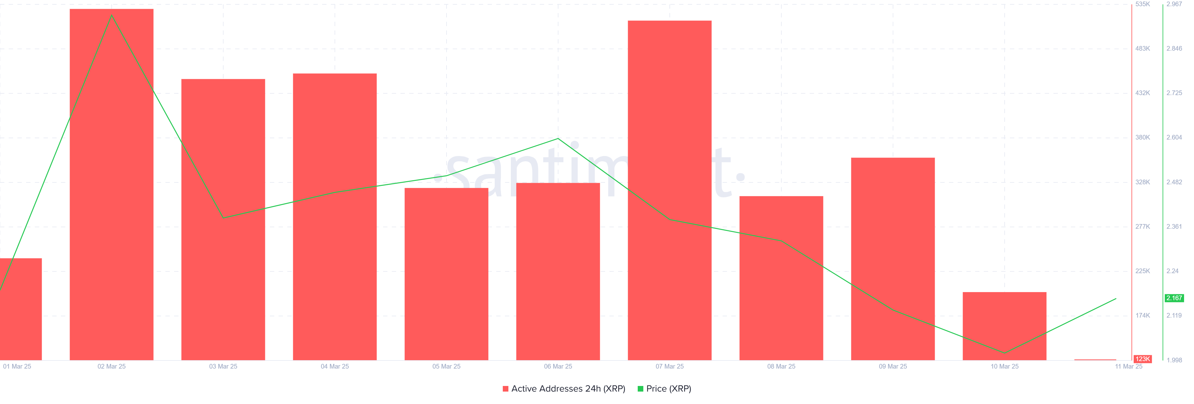 XRP’nin piyasa duyarlılığı devam eden belirsizliği yansıtıyor, aktif adreslerde katılımda önemli bir düşüş görülüyor. Son günlerde, yatırımcı kararlılığı büyük ölçüde düşüş eğilimindeki piyasa işaretleri nedeniyle zayıflıyor. Sonuç olarak, aktif adres sayısı 530.000’den sadece 123.000’e düştü, bu da altcoin’e olan ilginin hızla azaldığını gösteriyor.