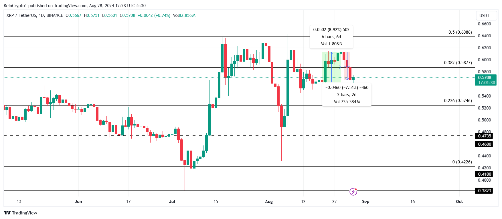 Diğer altcoin’ler gibi, XRP fiyatı son iki günde genel piyasa çöküşünün kurbanı oldu. Kripto para, son altı haftada dördüncü kez %38,2 Fibonacci Geri Çekilme seviyesinin altına düştü.