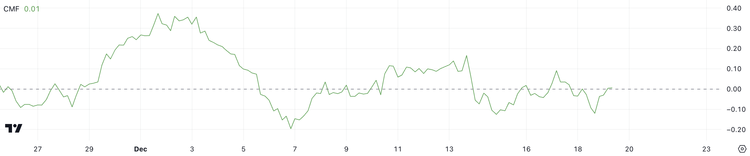 CMF (Chaikin Para Akışı), belirli bir dönemdeki sermaye giriş ve çıkışlarının gücünü ölçer. 0’ın üzerindeki değerler net pozitif girişleri, yani alım baskısını işaret ederken, 0’ın altındaki değerler net çıkışları ve satış baskısını gösterir.