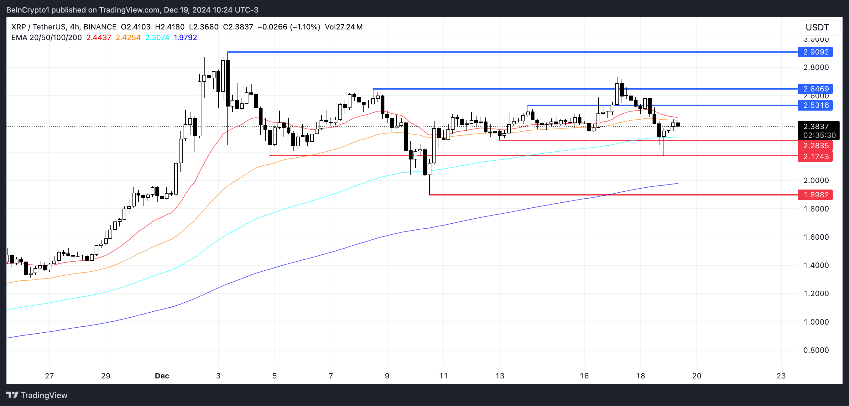 XRP, 2,28 dolar ile 2,53 dolar arasında önemli bir aralıkta işlem görüyor. Destek seviyesinin altına düşülmesi, fiyatın 1,89 dolara doğru önemli bir düzeltme yapmasına yol açabilir. Ancak, alıcılar kontrolü yeniden ele geçirirse, XRP 2,53 dolar ve 2,90 dolar dirençlerini test edebilir ve son yükseliş ivmesini yeniden kazanmayı hedefleyebilir.