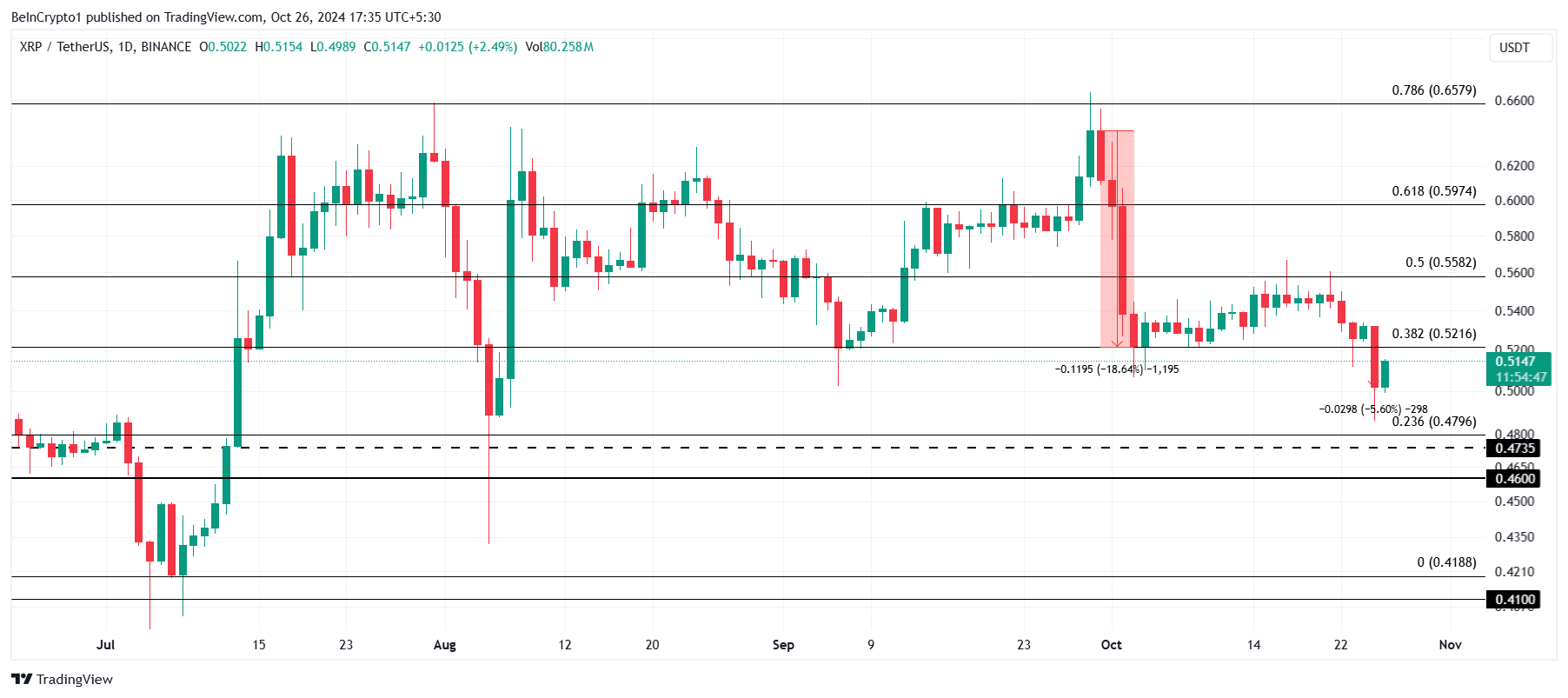 XRP fiyatı Ekim başından bu yana düşüşte ve bu durum yatırımcılar arasında endişe yaratıyor. Başlangıçta 0,60 doların üzerinde işlem gören altcoin, şimdi 0,51 dolara düştü.