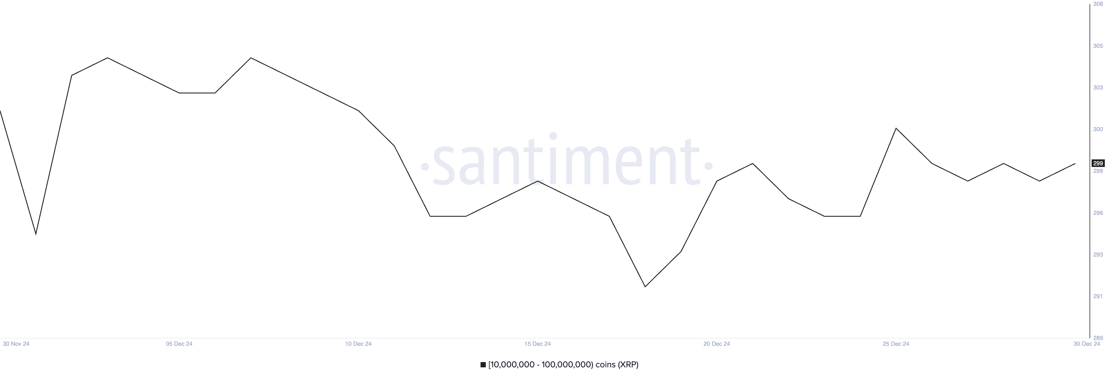 Bununla birlikte, sayı hafifçe azaldı. 26 Aralık’tan bu yana 298 ile 299 arasında dalgalandı, bu da balina aktivitesinde bir istikrar dönemi olduğunu gösteriyor. Bu istikrarlı davranış, büyük yatırımcıların şu anda ne agresif bir şekilde XRP biriktirdiğini ne de sattığını gösteriyor.