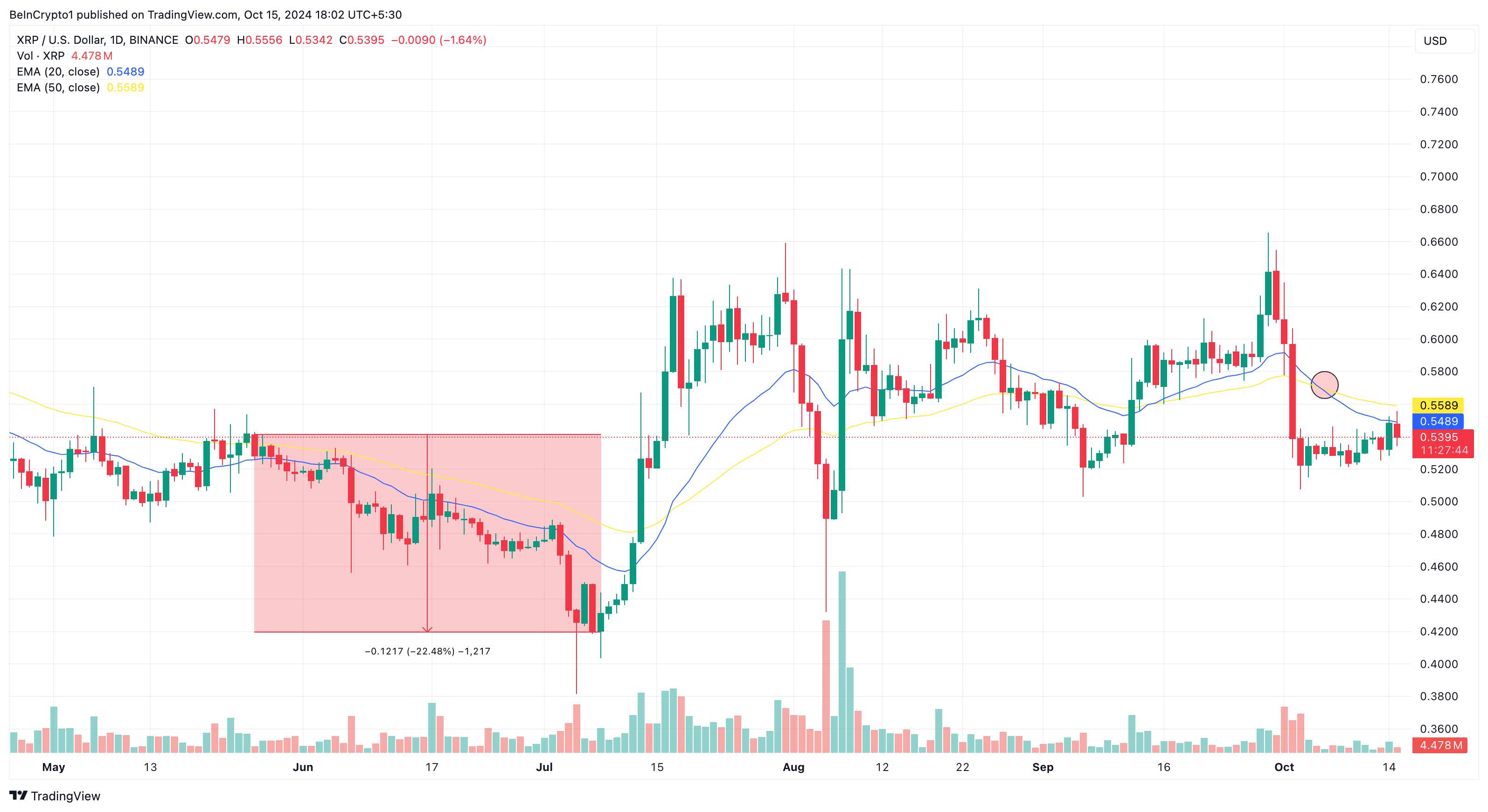 5 Ekim’de, XRP’nin günlük grafiğinde 20 Üssel Hareketli Ortalama (EMA) — mavi renkte, 50 EMA’nın (sarı) altına düştü. Bu durum, genellikle uzun süreli düşüş baskısını işaret eden bir düşüş modeli olan ölüm kesişimi olarak bilinir.