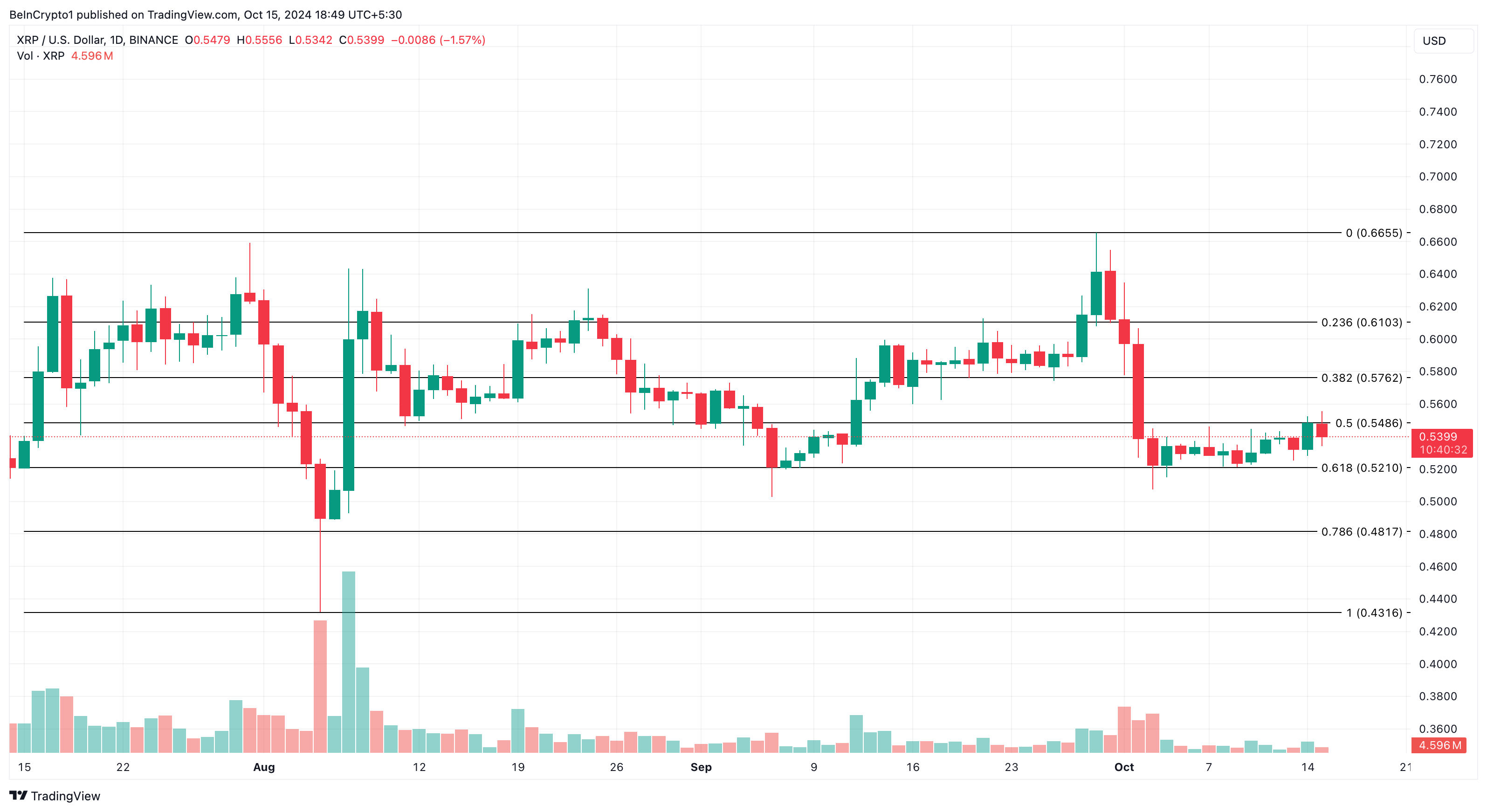 Günlük grafiğe bakıldığında, XRP’nin 0,55 dolarda dirençle karşılaşabileceği görülüyor. Burası %50 Fibonacci geri çekilme seviyesinin bulunduğu yerdi. Fibonacci geri çekilme göstergesi, güçlü destek veya direnç seviyelerini gösterir.