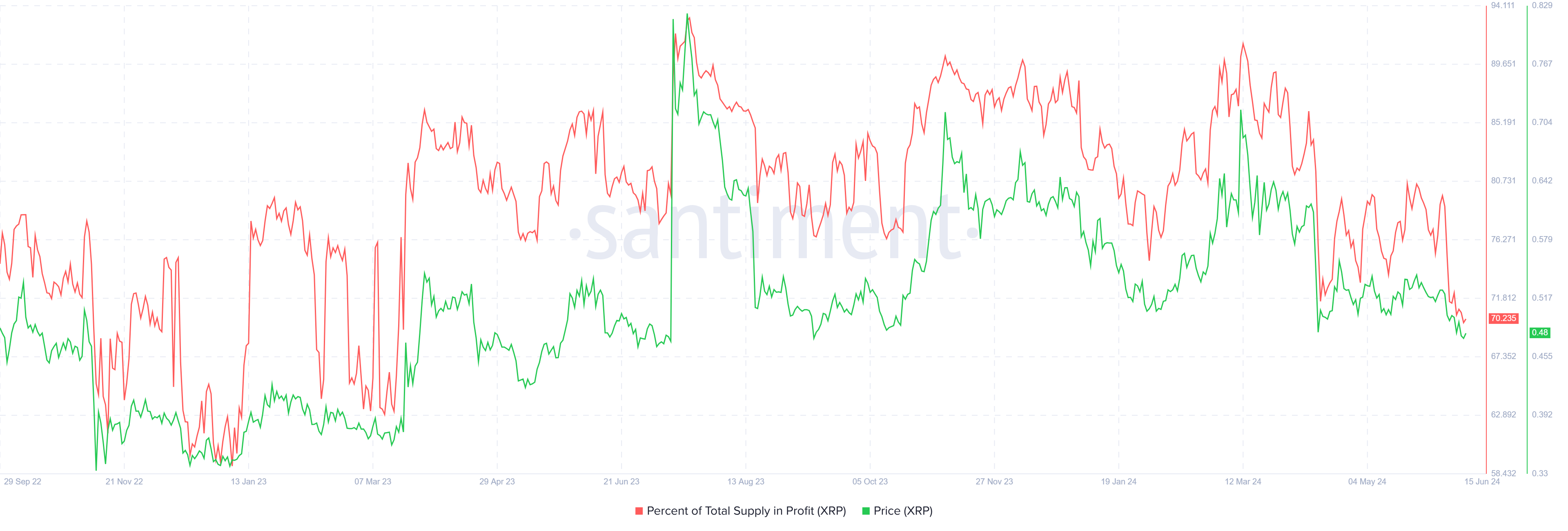 Bir varlığın toplam kar arzı %95’i geçtiğinde bir piyasa zirvesi onaylanır. Bununla birlikte, XRP’nin toplam kar arzı %70’te bulunuyor ve bu değer bir düşüşe işaret etmekten oldukça uzak.