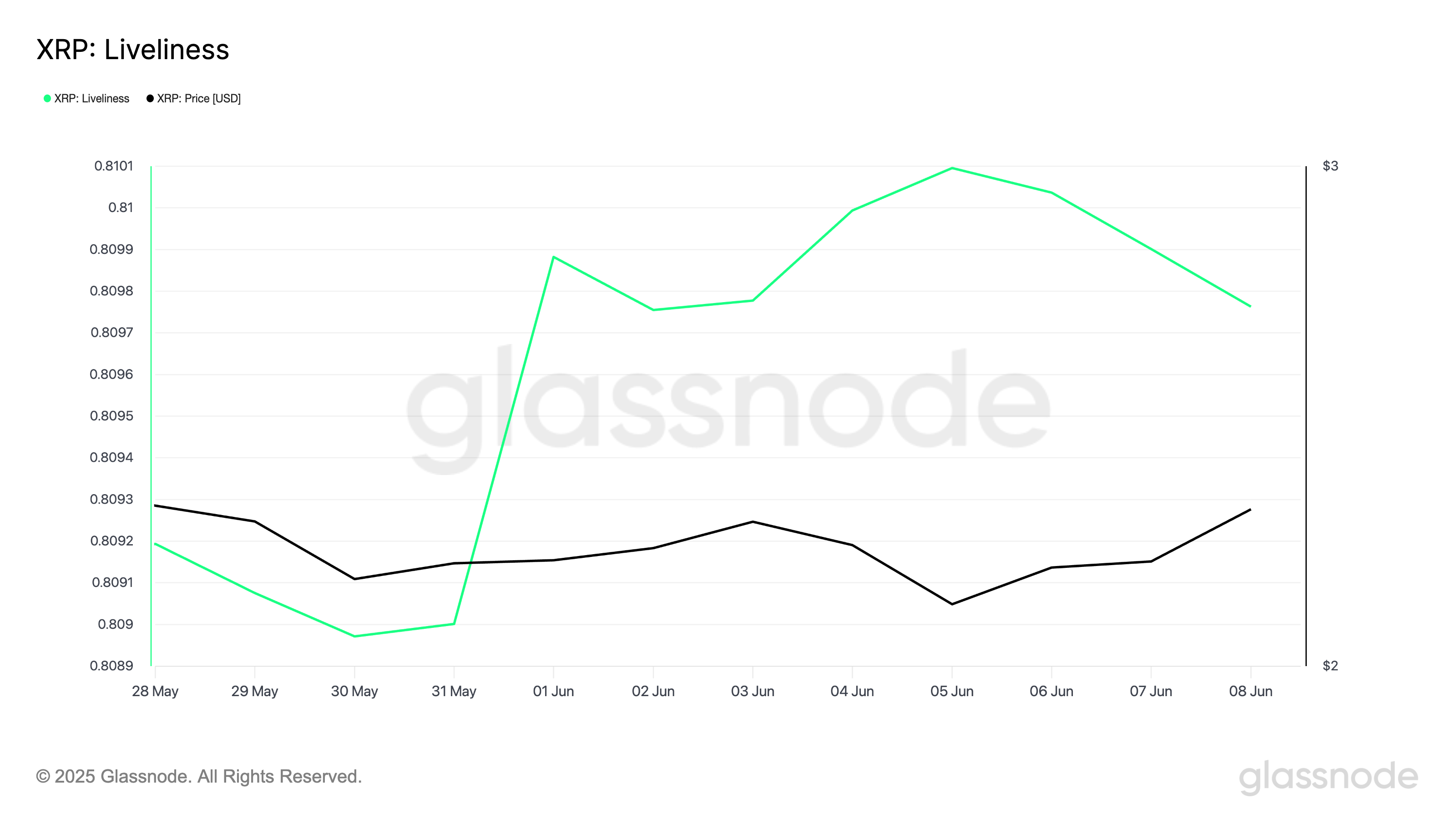 Glassnode verilerine göre, XRP’nin canlılığı 5 Haziran’dan bu yana istikrarlı bir şekilde azalarak 8 Haziran itibarıyla %1 düşüşle 0,809 seviyesine geriledi ve bu durum LTH’ler arasında azalan aktiviteyi işaret ediyor.