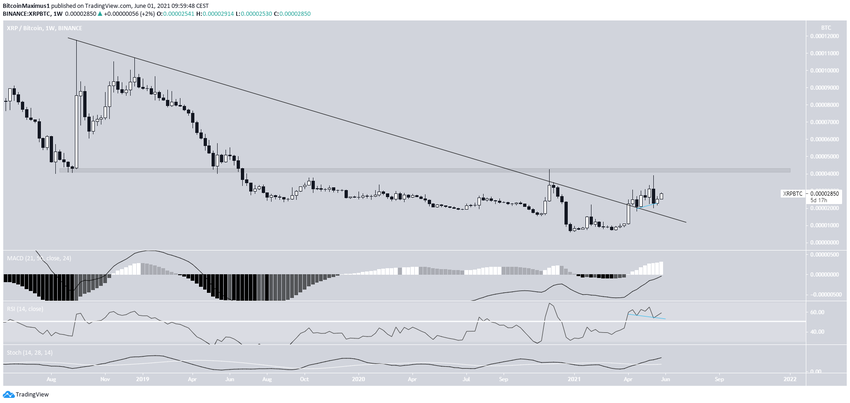 XRP/BTC paritesindeki fiyat için haftalık grafik, olumlu bir görünüm sergiliyor ve grafiğe bakıldığında, XRP’nin bir alçalan direnç çizgisinden çıkış gerçekleştirdiği görülüyor. Ayrıca bu direnç çizgisinin, 2018 yılı Ağustos ayından bu yana varlığını koruduğu da biliniyor. Dolayısıyla XRP/BTC paritesinde fiyatın, XRP/USD paritesindeki fiyata benzer şekilde, 0,66 dolar bölgesini aştığı söylenebilir.