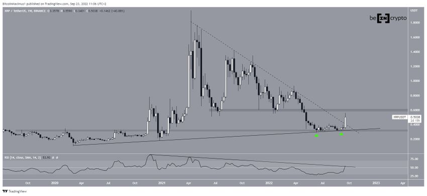 Haziran ve Eylül aylarında XRP, uzun vadeli yükselen destek çizgisinden ve 0,32 dolar yatay destek bölgesinden sıçrama gerçekleştirdi (yeşil simgeler). Ardından güçlü bir yükselişe başlayan popüler altcoin, uzun vadeli alçalan direnç çizgisinden çıkış yapmayı başardı (kesik çizgi).
