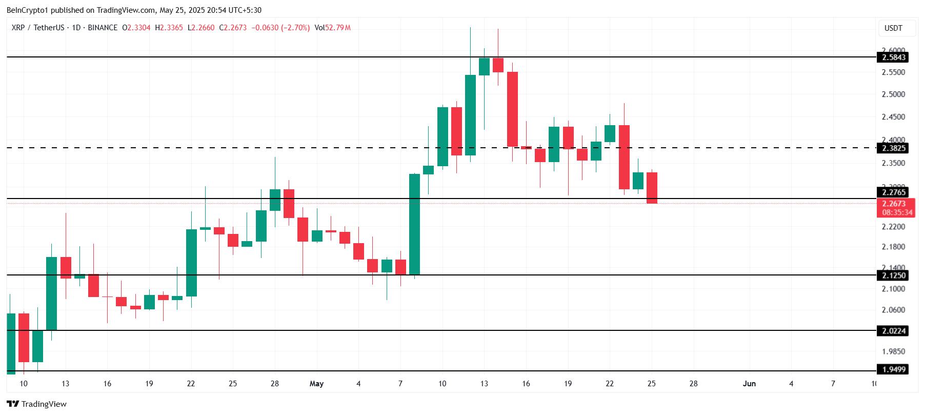 XRP şu anda 2,26 Dolar’dan işlem görüyor ve son 24 saat içinde 2,27 Dolar destek seviyesinin altına düştü. Fiyat, 2,58 Dolar direncini kıramadığı için son iki haftadır istikrarlı bir düşüşte.
