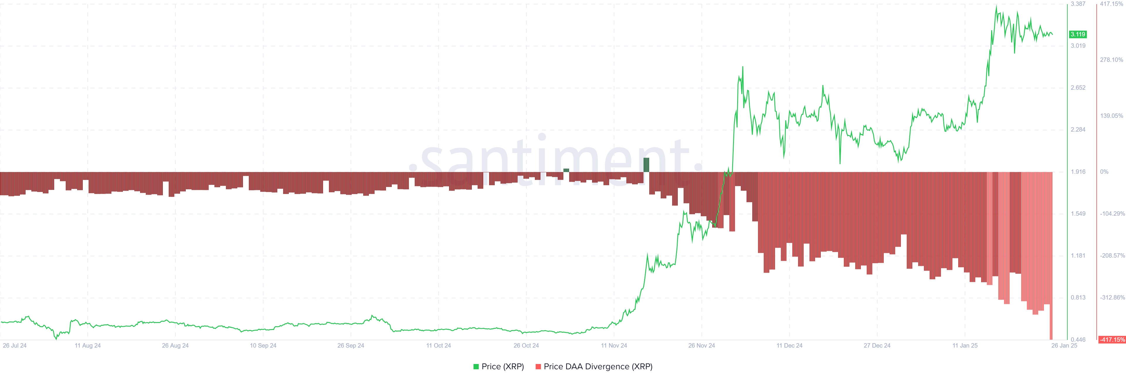 Potansiyel bir düzeltmeye işaret eden ana sinyallerden biri, satış sinyali veren Fiyat Günlük Aktif Adresler (DAA) Farklılığı. Yükseliş fiyat hareketine rağmen, XRP ile etkileşimde bulunan aktif cüzdan adreslerinin sayısında belirgin bir düşüş gözlemleniyor. Fiyat ve katılım arasındaki bu farklılık, genellikle azalan yatırımcı ilgisinin bir işareti olup, bu da XRP’nin fiyatı üzerinde olumsuz bir etki yaratabilir.
